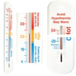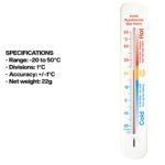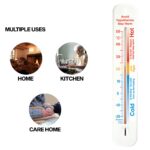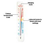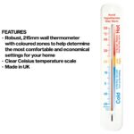 White plastic wall thermometer with coloured zones to help determine the most comfortable and economical settings for your home.