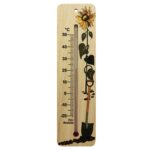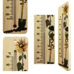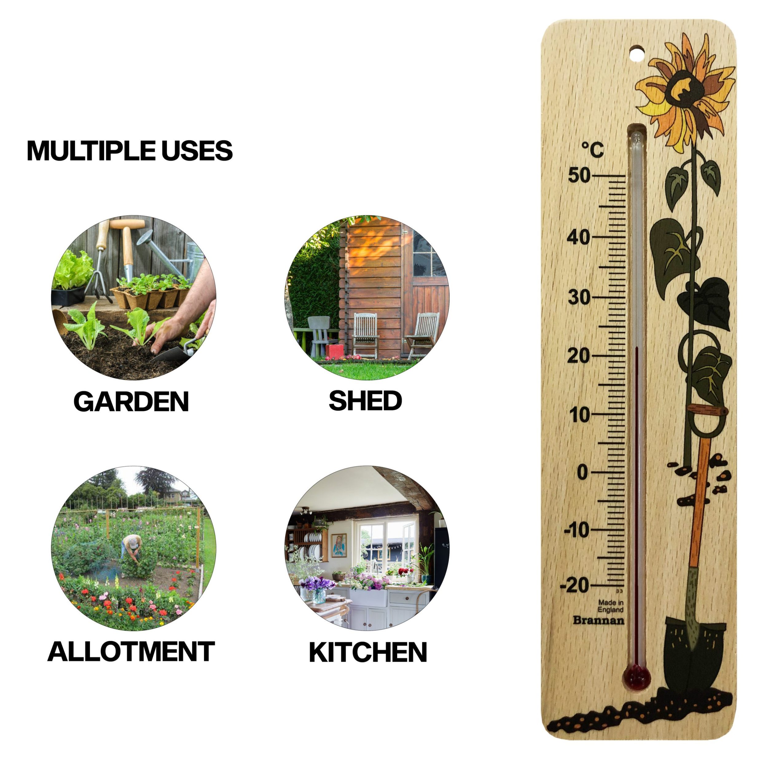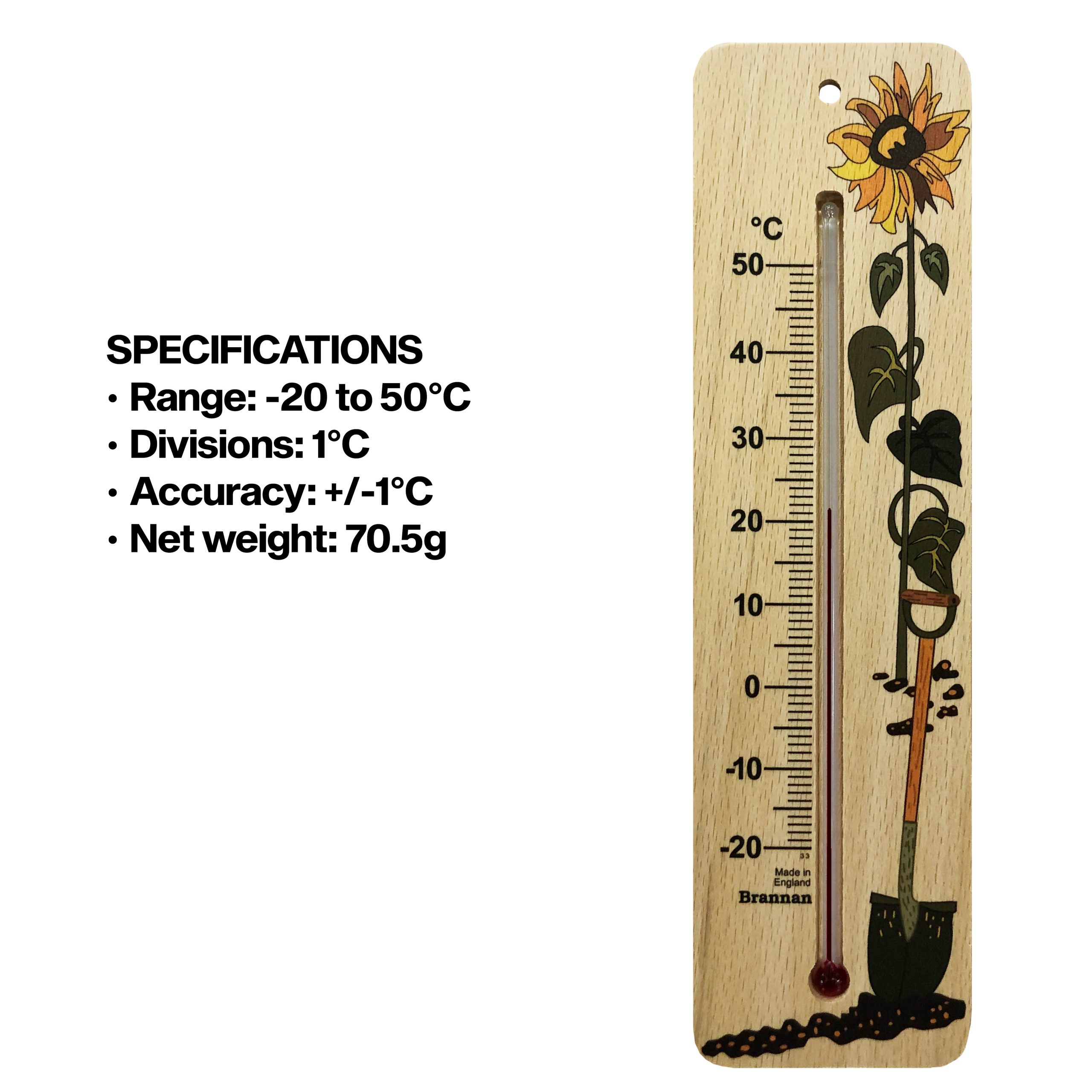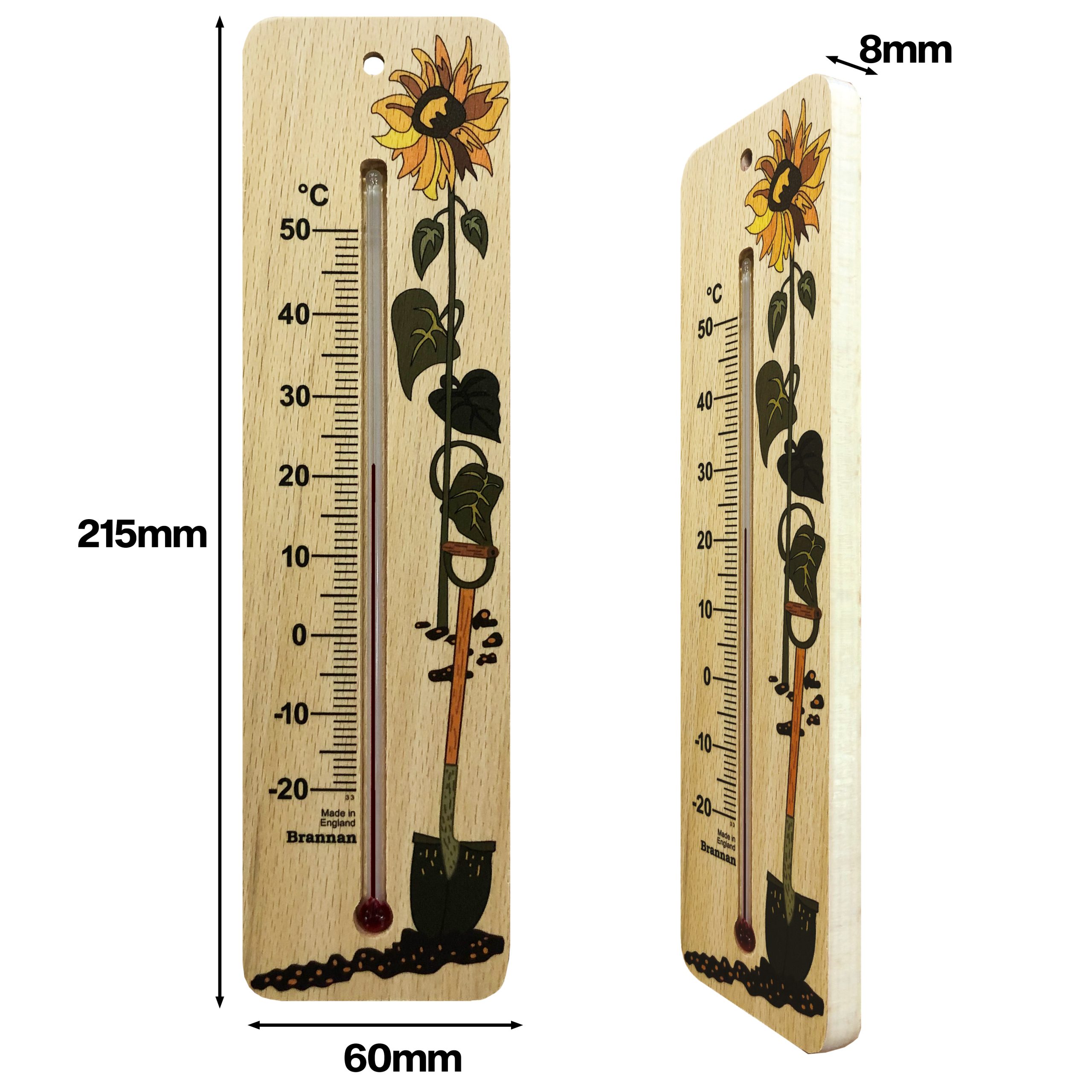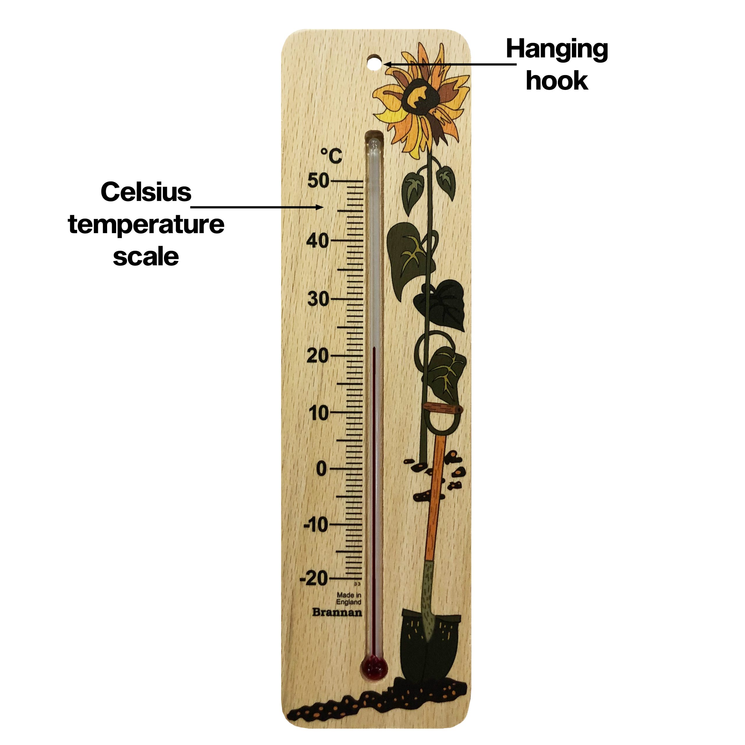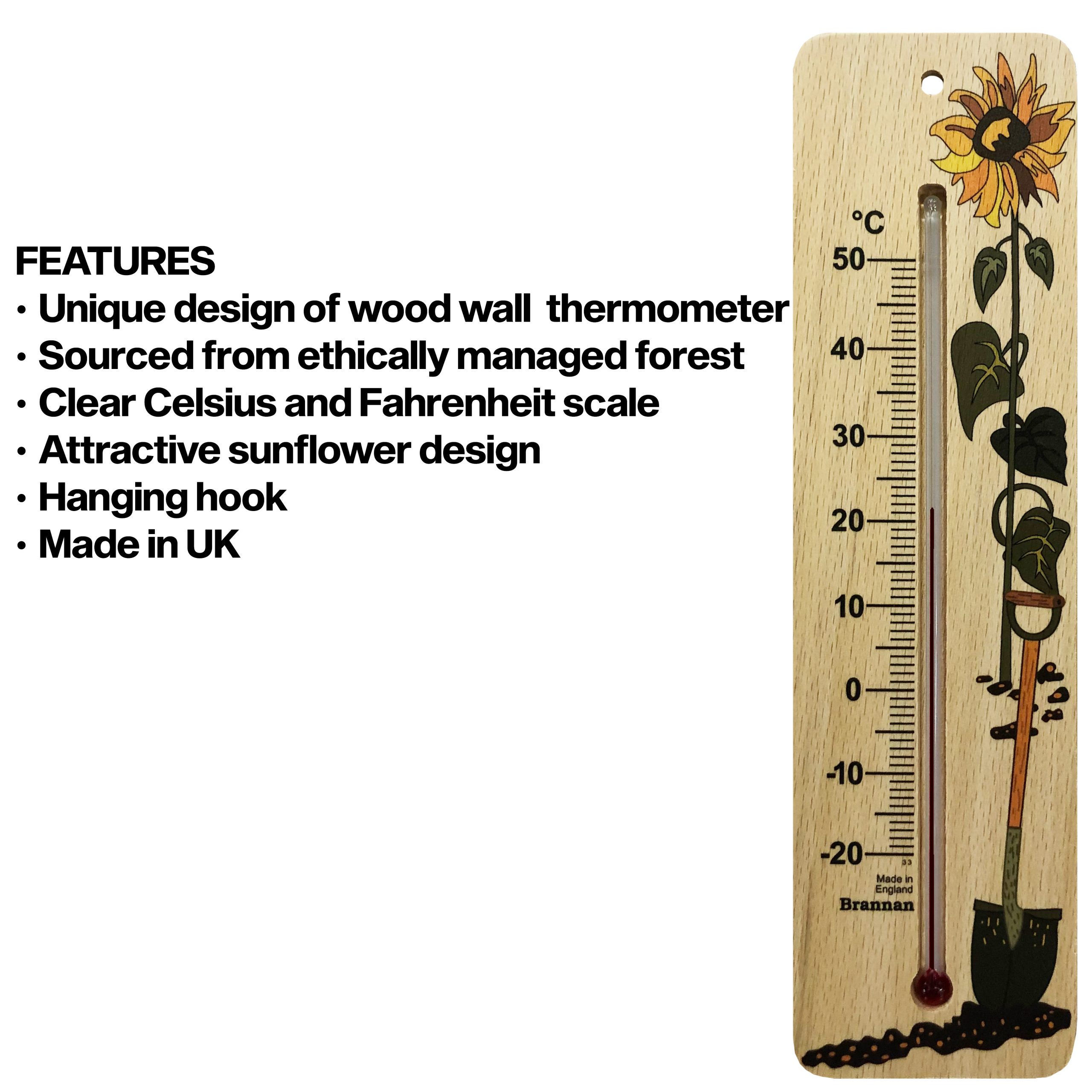 Ethically sourced, wood wall thermometer with clear printed temperature scale. This environmentally friendly thermometer has and attractive sunflower design and is the perfect accessory for your home or garden. (Place in sheltered position if siting outdoors.)