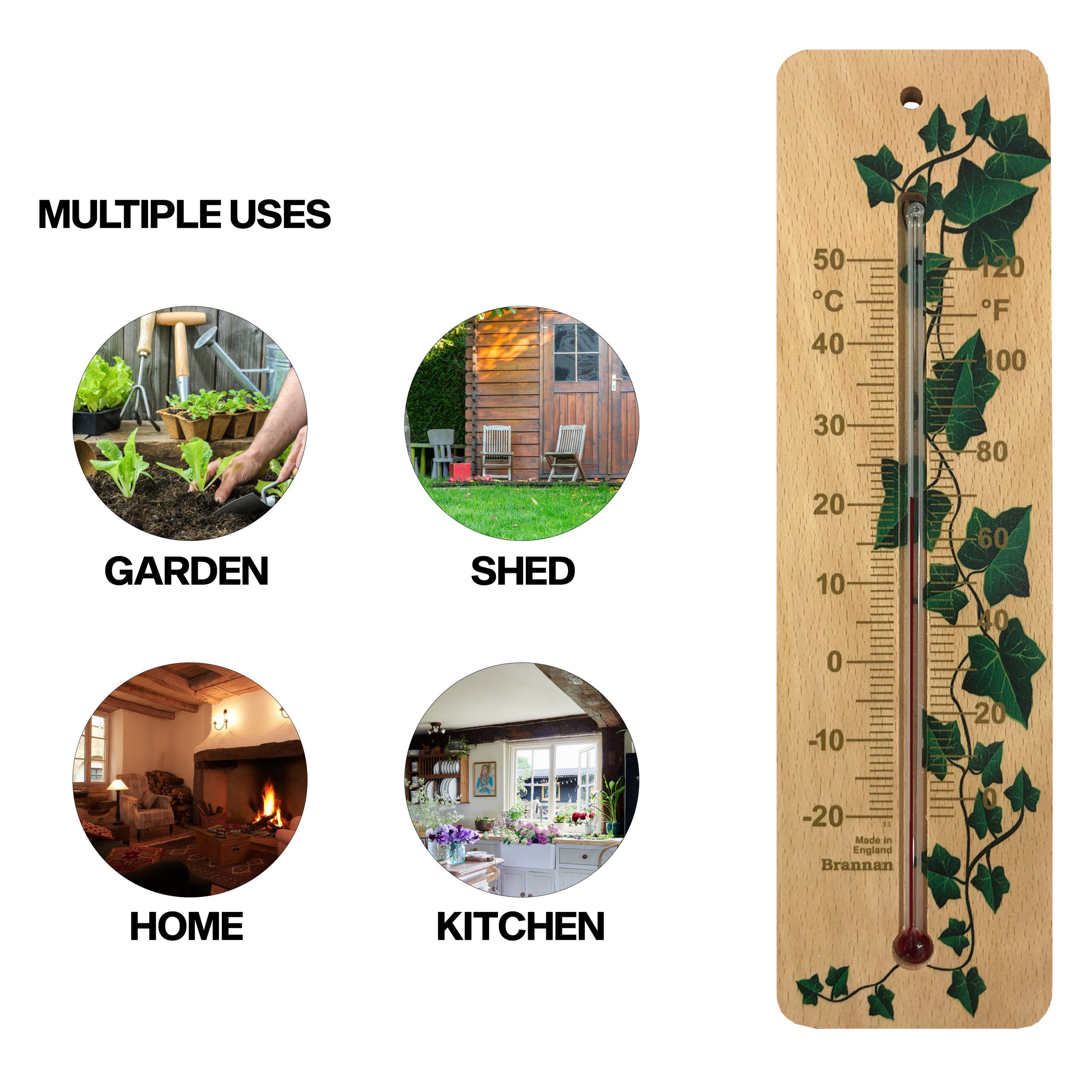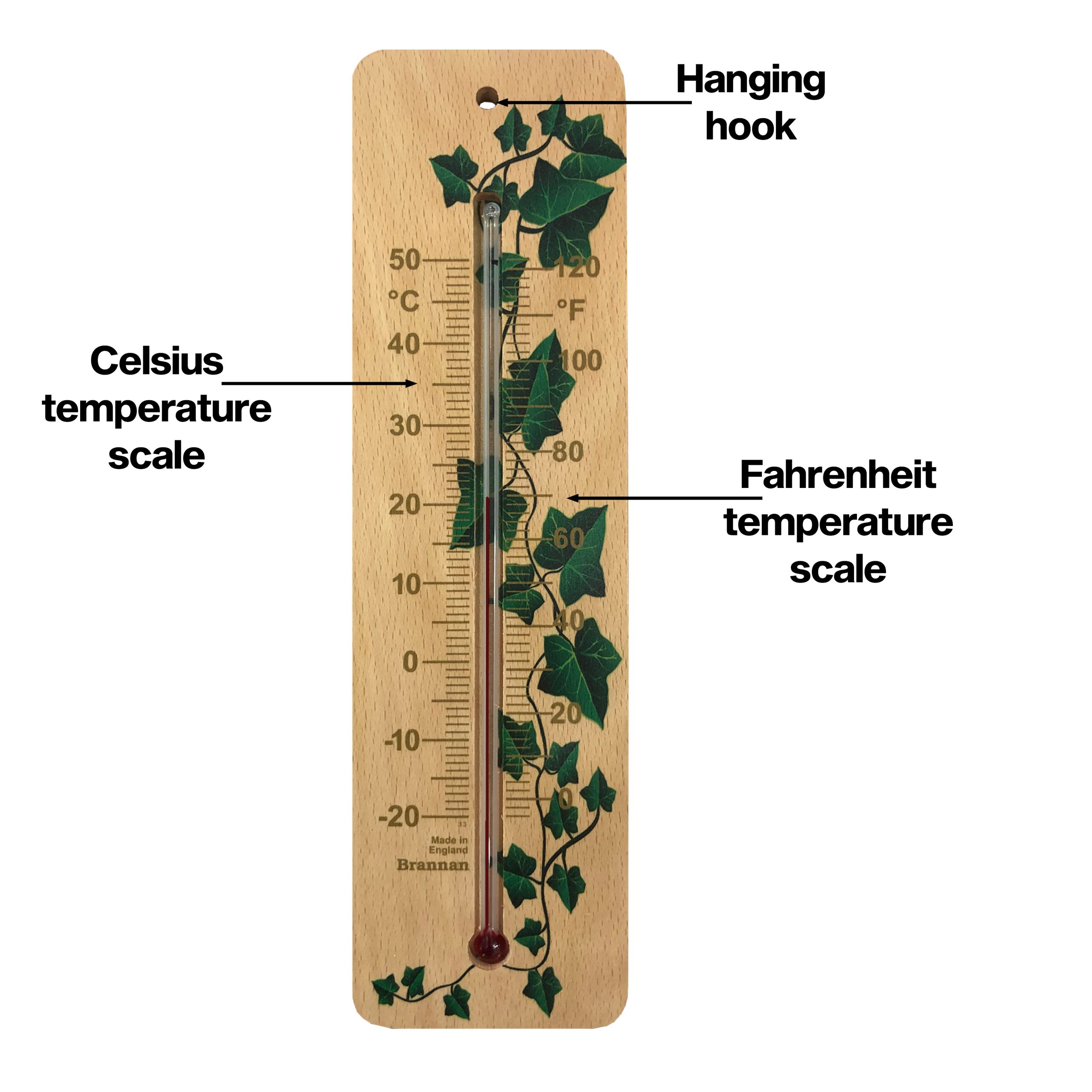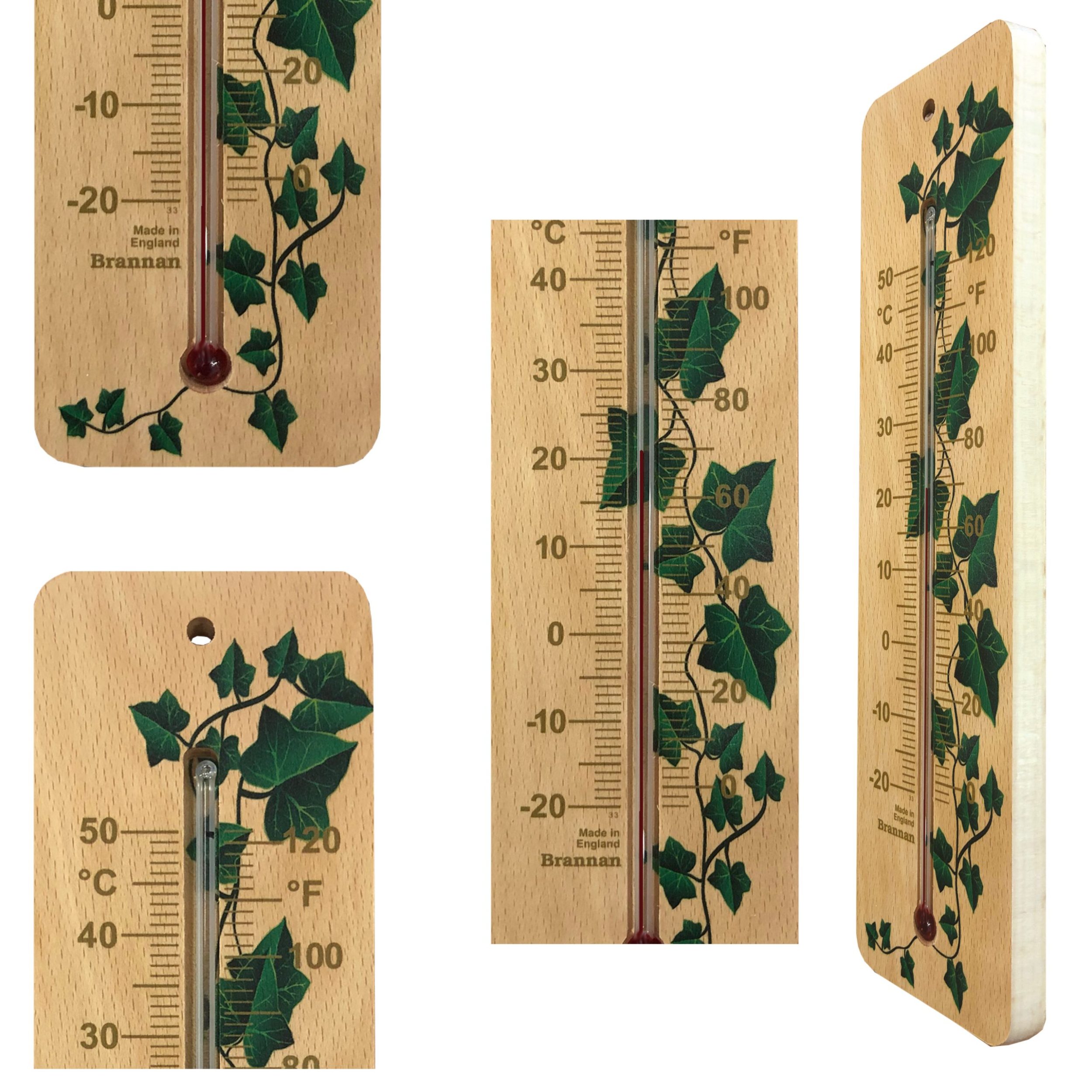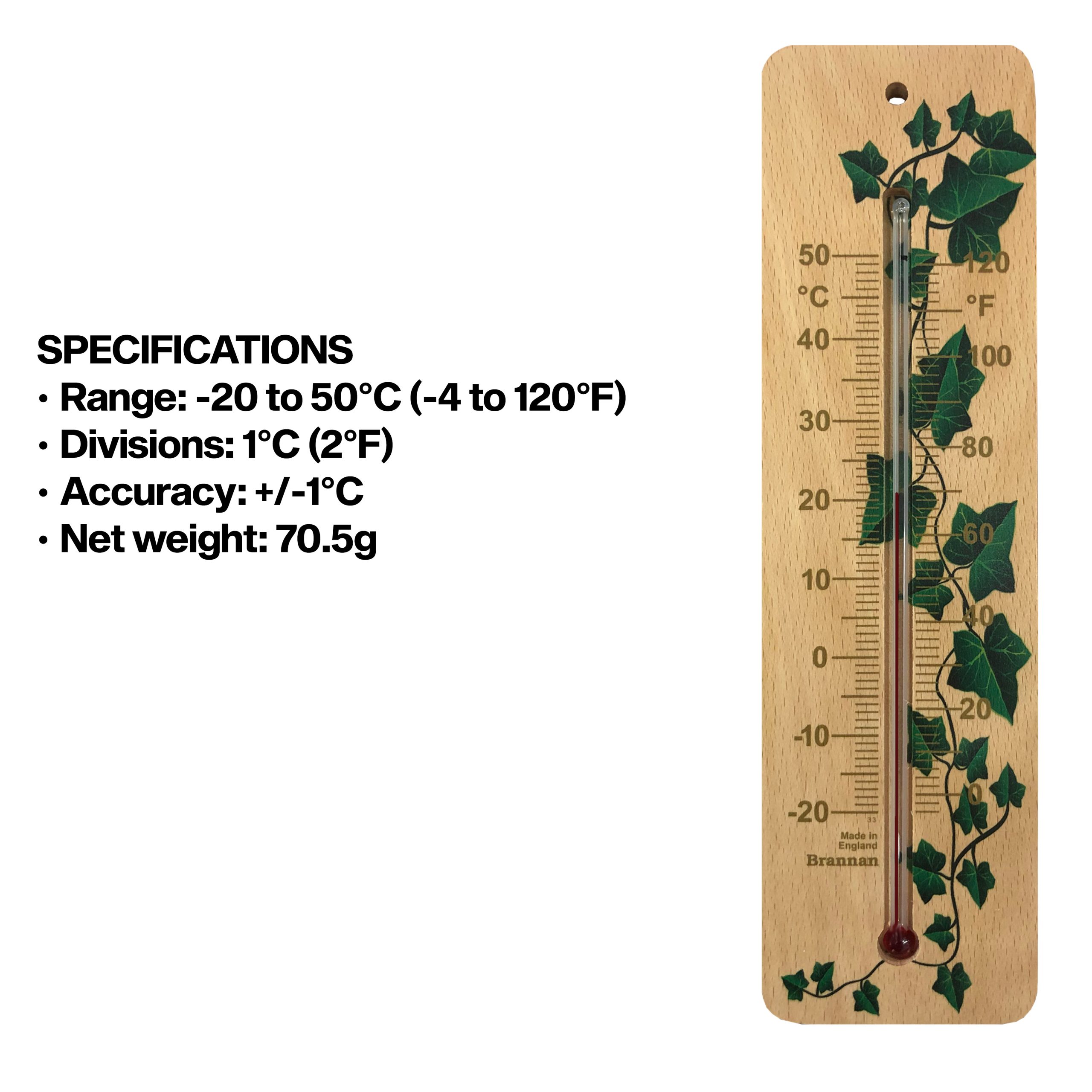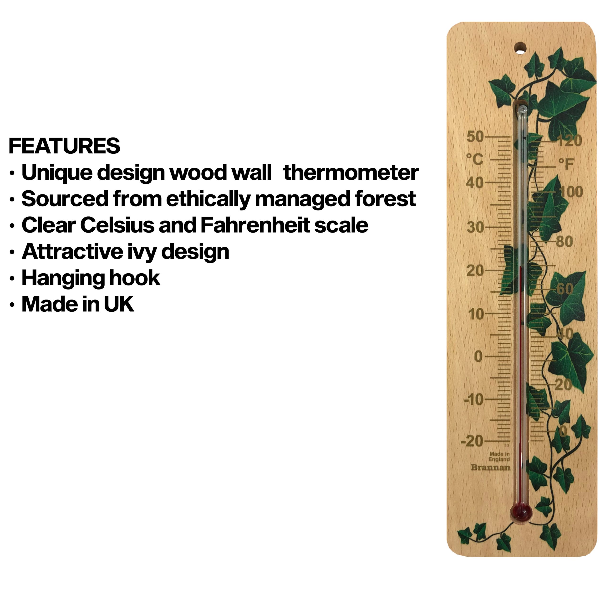 Ethically sourced, wood wall thermometer with clear printed temperature scale. This environmentally friendly thermometer has and attractive ivy design and is the perfect accessory for your home or garden. (Place in sheltered position if siting outdoors.)