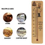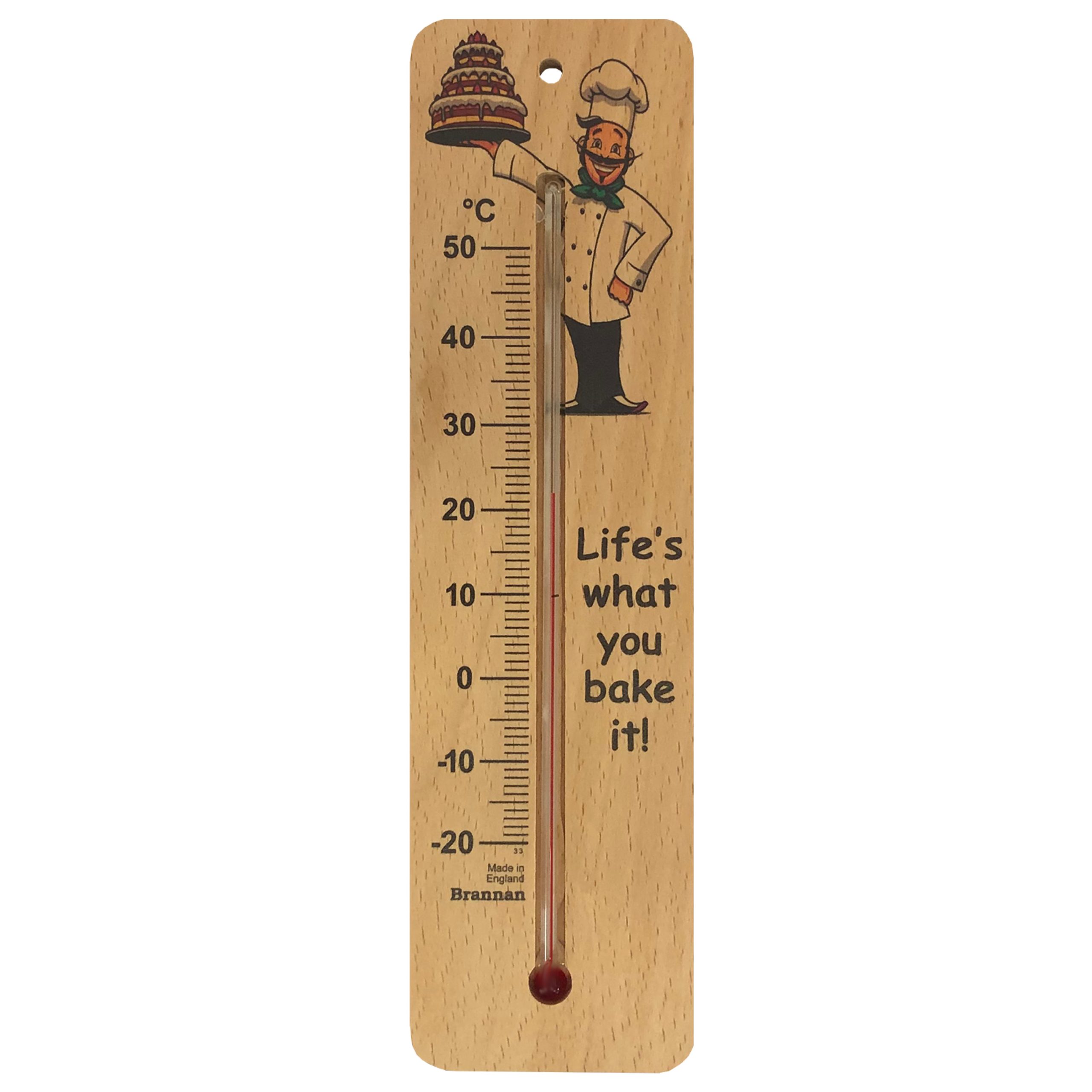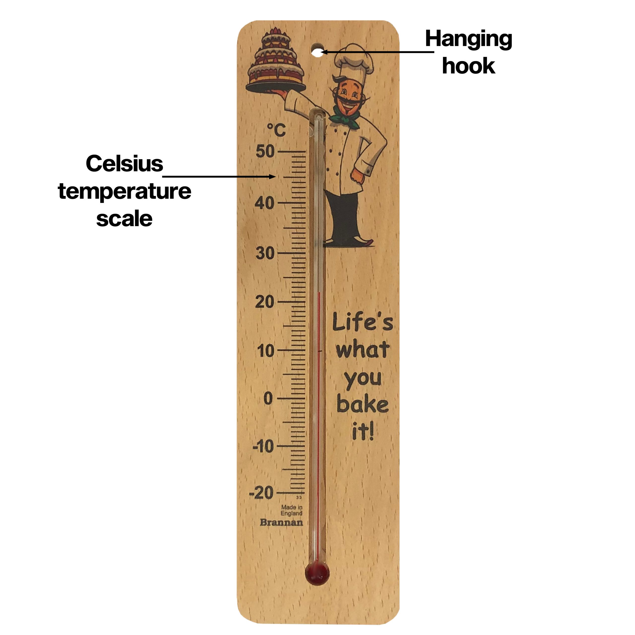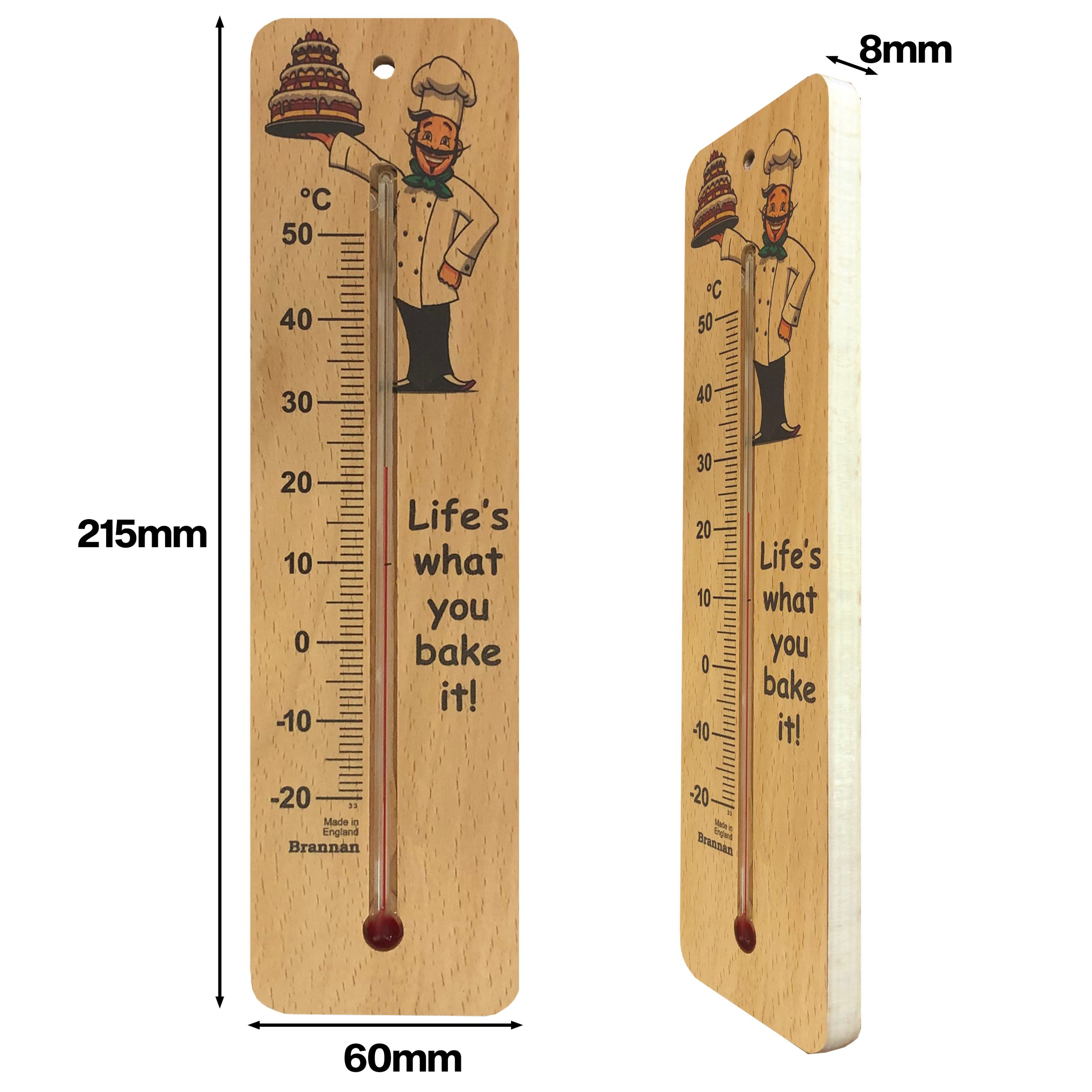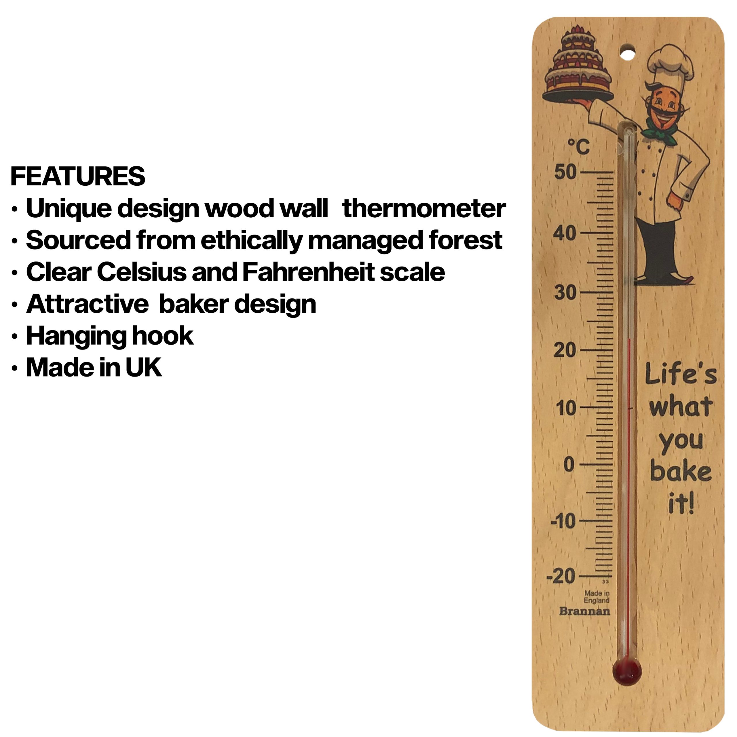Ethically sourced, wood wall thermometer with clear printed temperature scale. This environmentally friendly thermometer has and attractive pastry chef design and is the perfect accessory for your kitchen.
