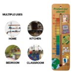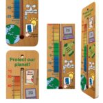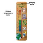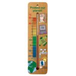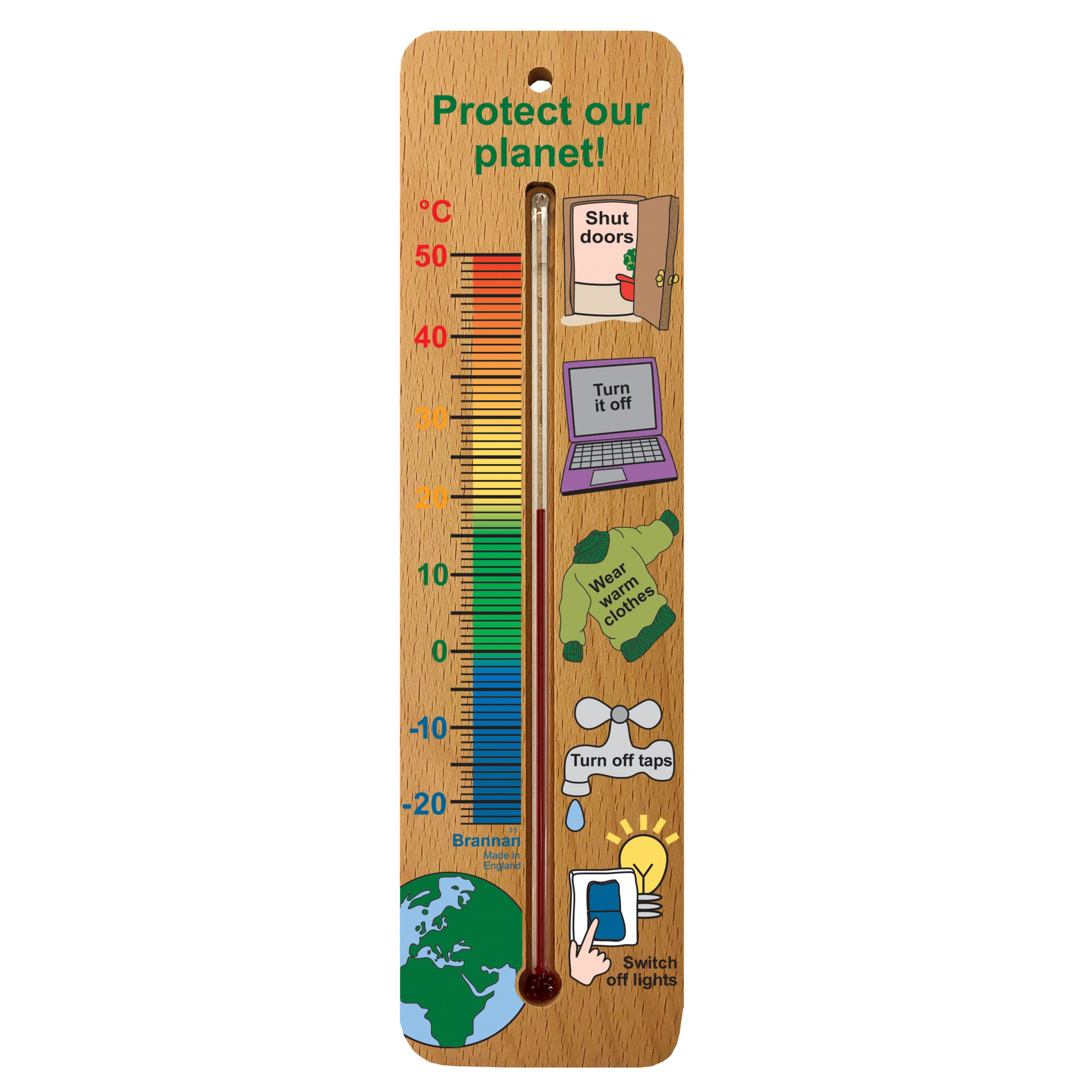 Ethically sourced, wood wall thermometer with clear printed temperature scale. This thermometer is printed with a child-friendly, bright, coloured scale and handy tips to encourage responsible habits to help reduce energy usage.