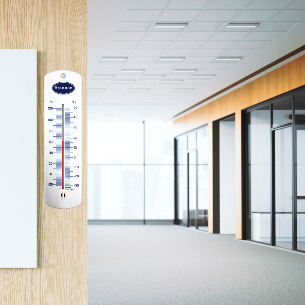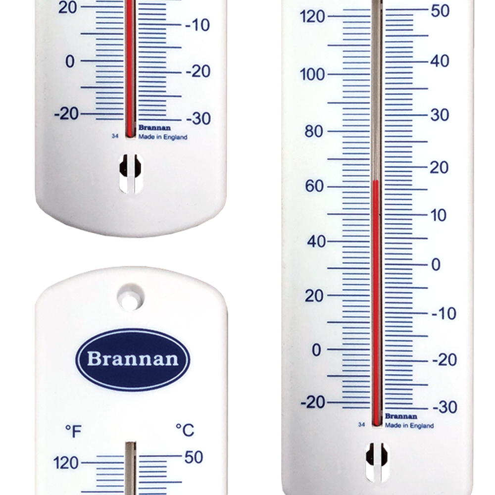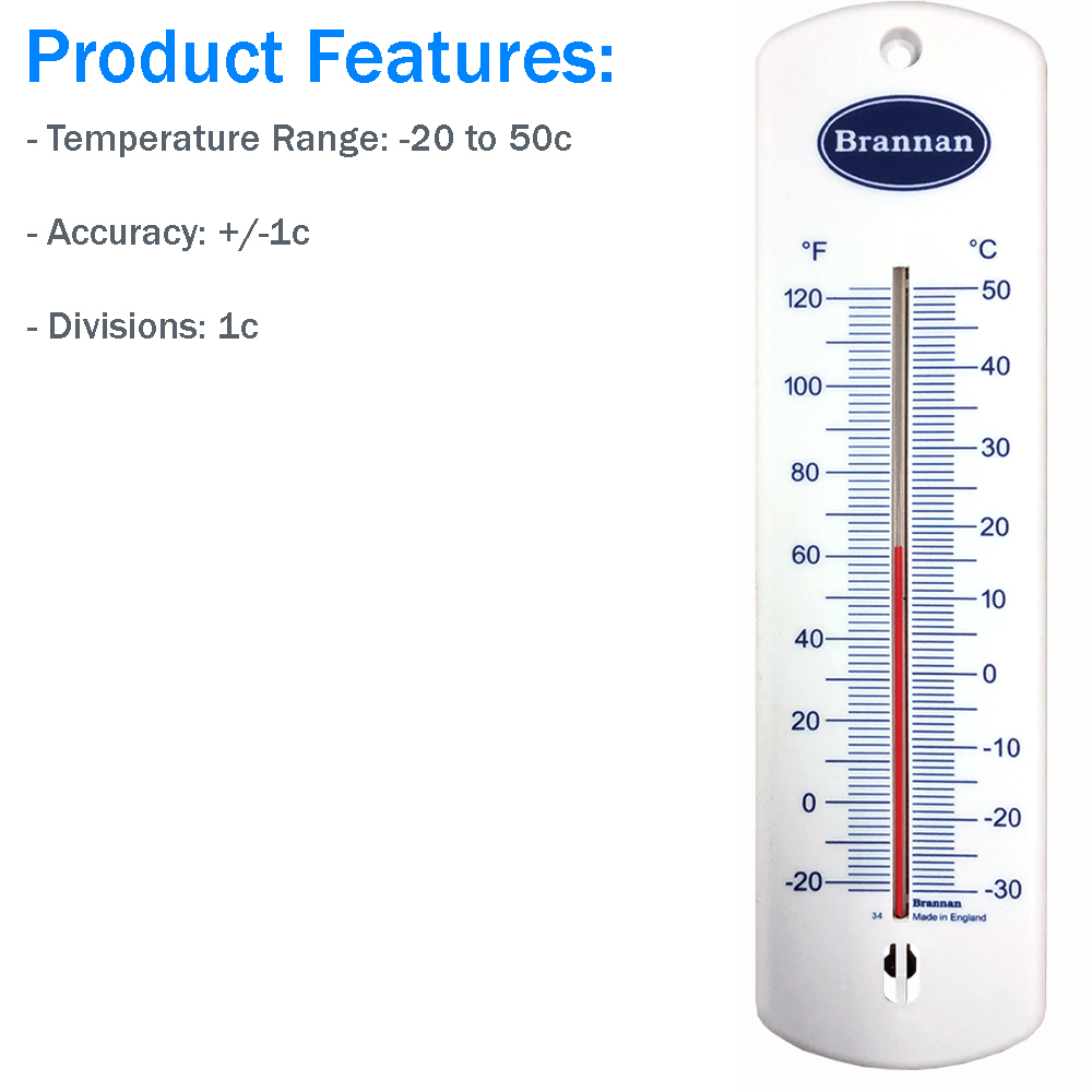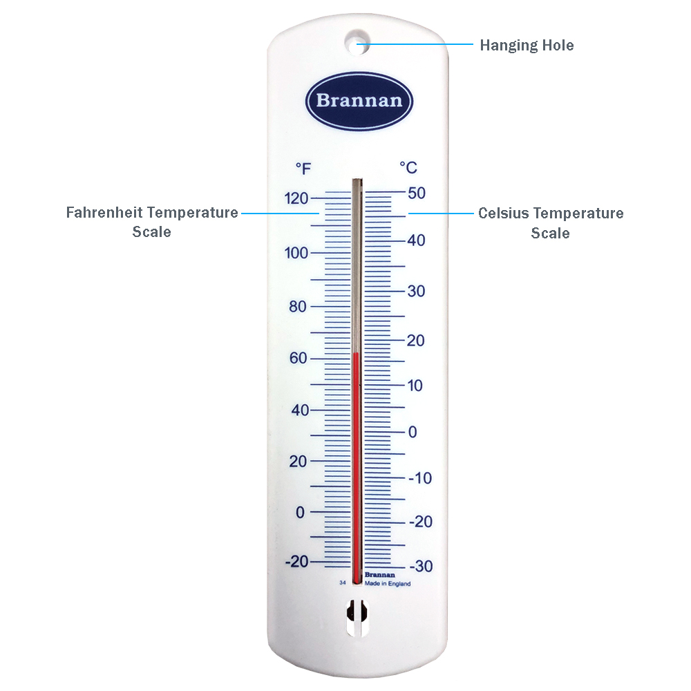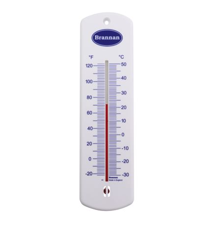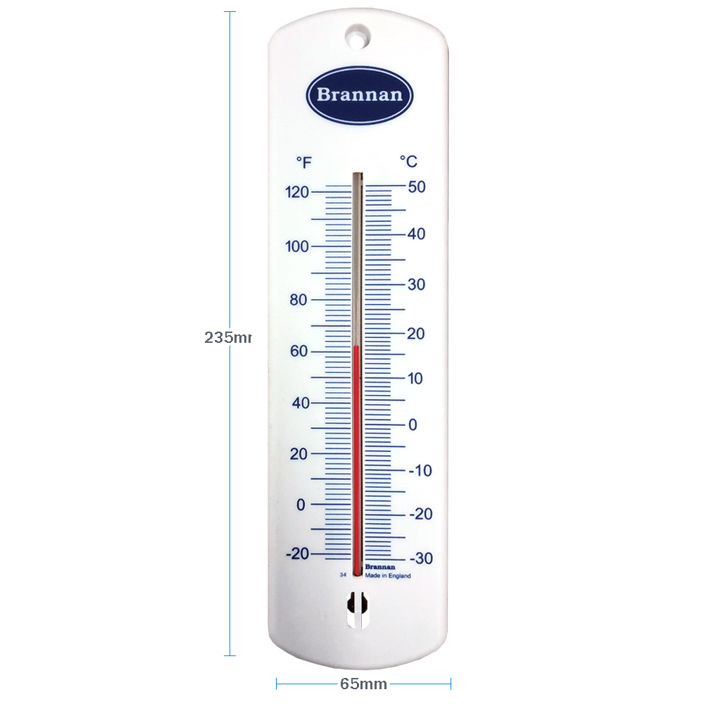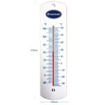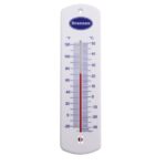 240mm plastic wall thermometer with clear, blue printed scale. Suitable for indoor or outdoor use in the home or garden.