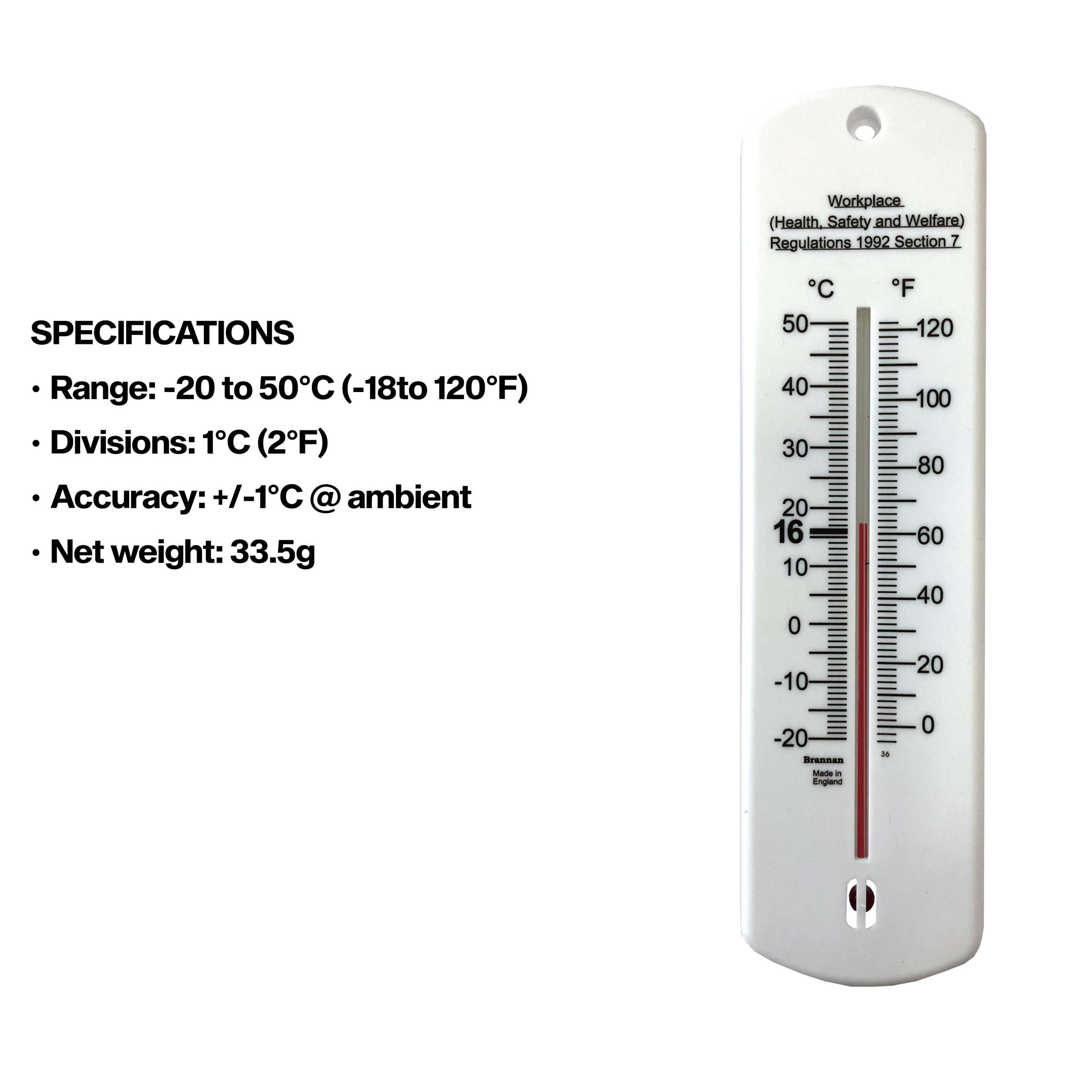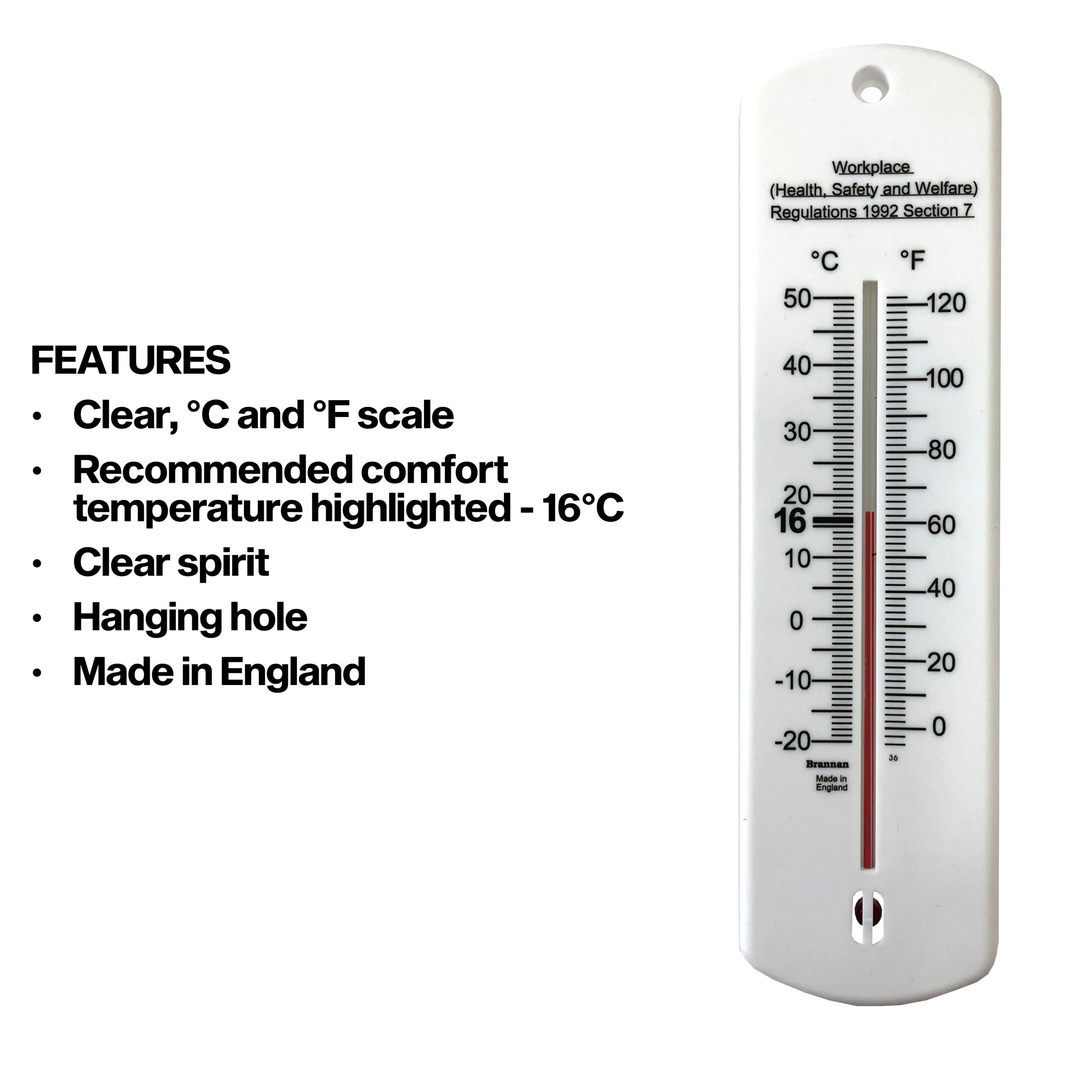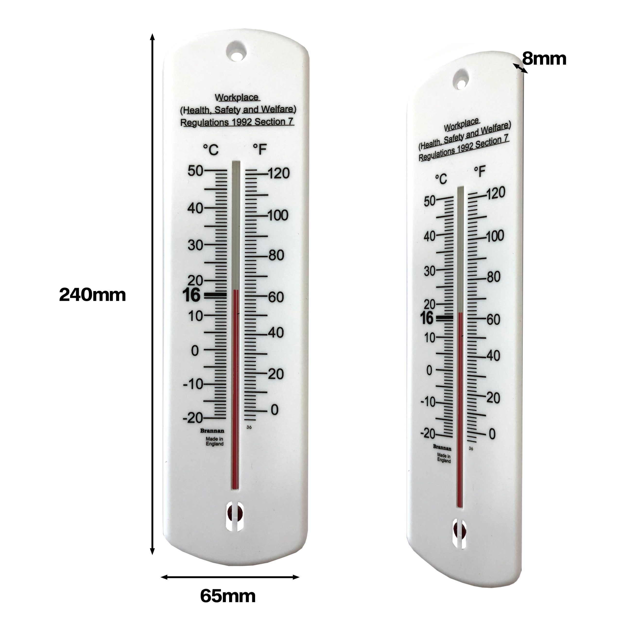 240mm wall thermometer moulded in white plastic with recommended temperature for the workplace, in accordance with The Workplace (Health, Safety & Welfare) Regulations 1992, Section 7.