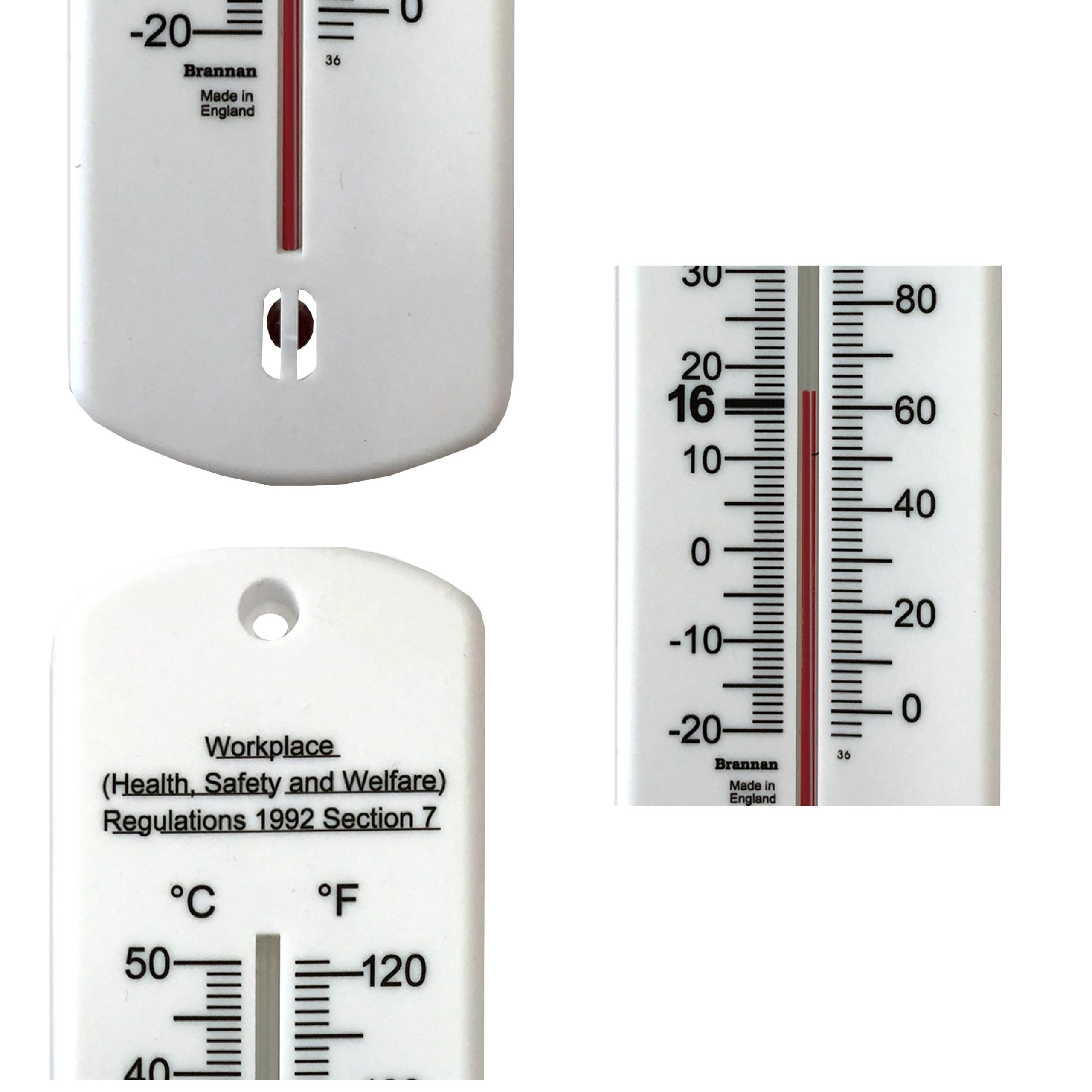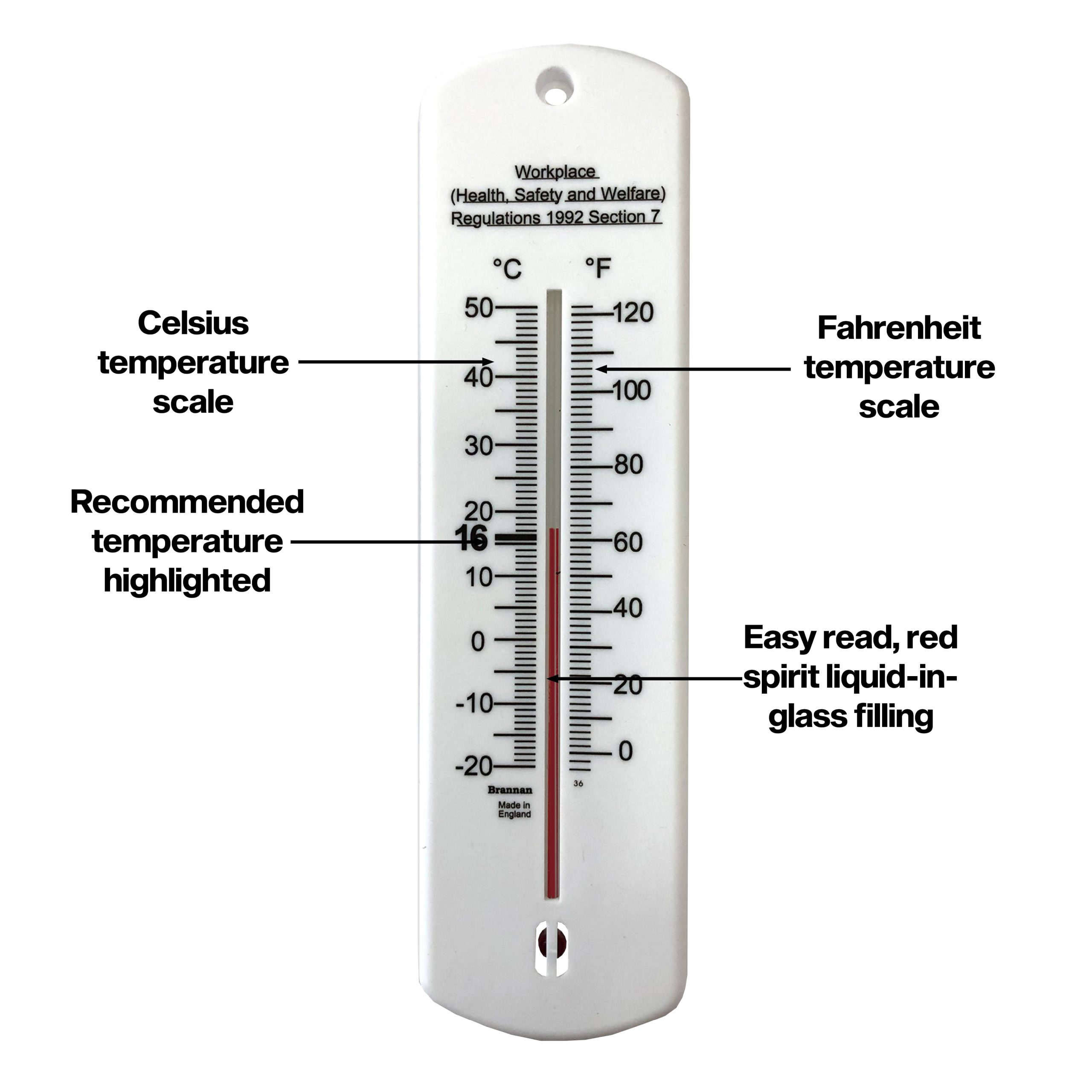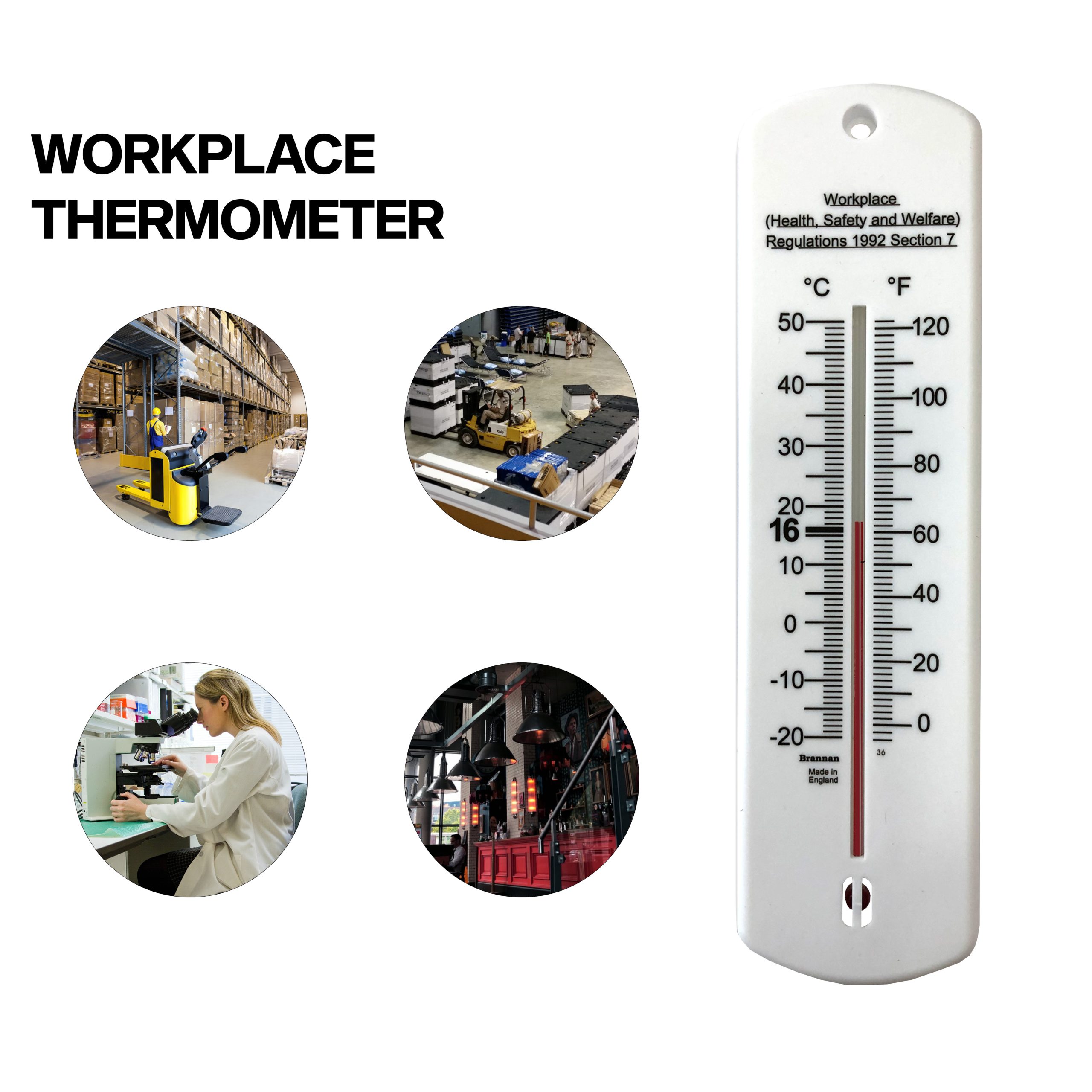 240mm wall thermometer moulded in white plastic with recommended temperature for the workplace, in accordance with The Workplace (Health, Safety & Welfare) Regulations 1992, Section 7.