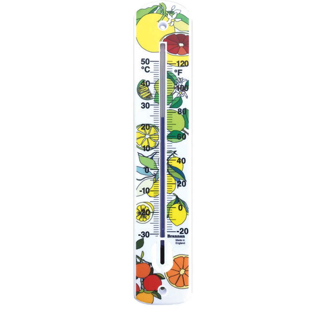 380mm large plastic wall thermometer with attractive citrus design. With clear printed temperature scales on white moulding. Suitable for indoor and outdoor use, these thermometers are ideal for use in the home or the garden.