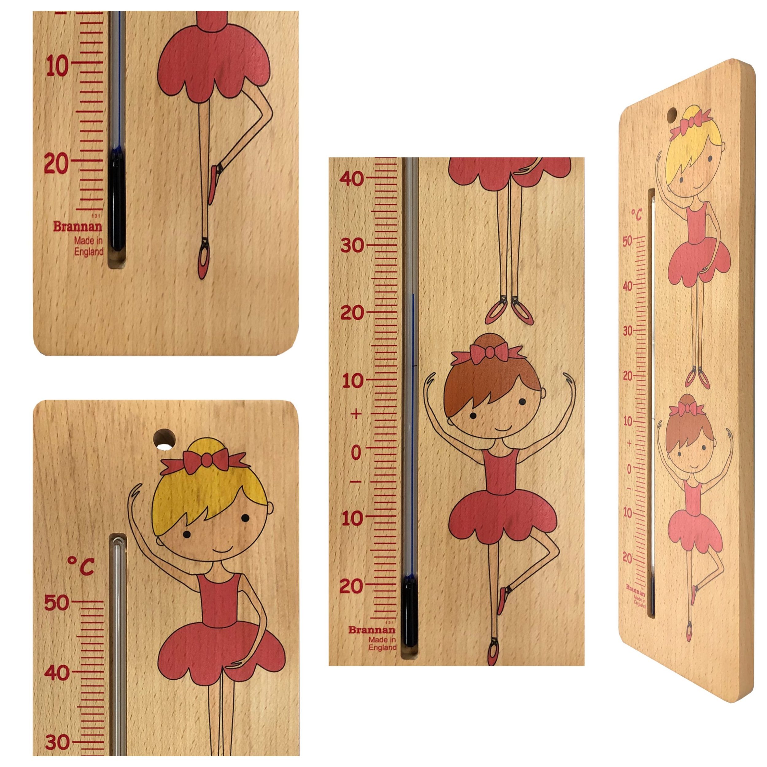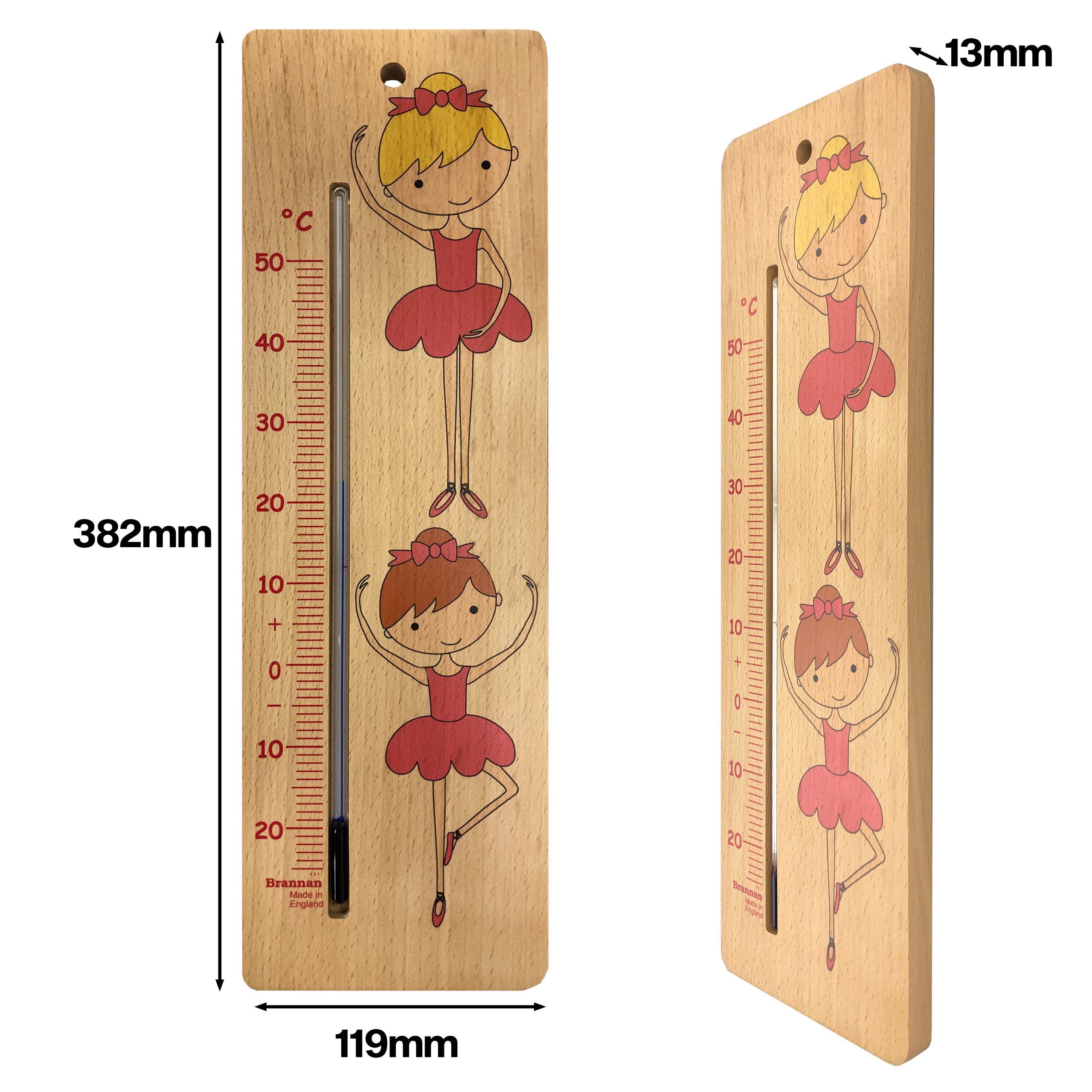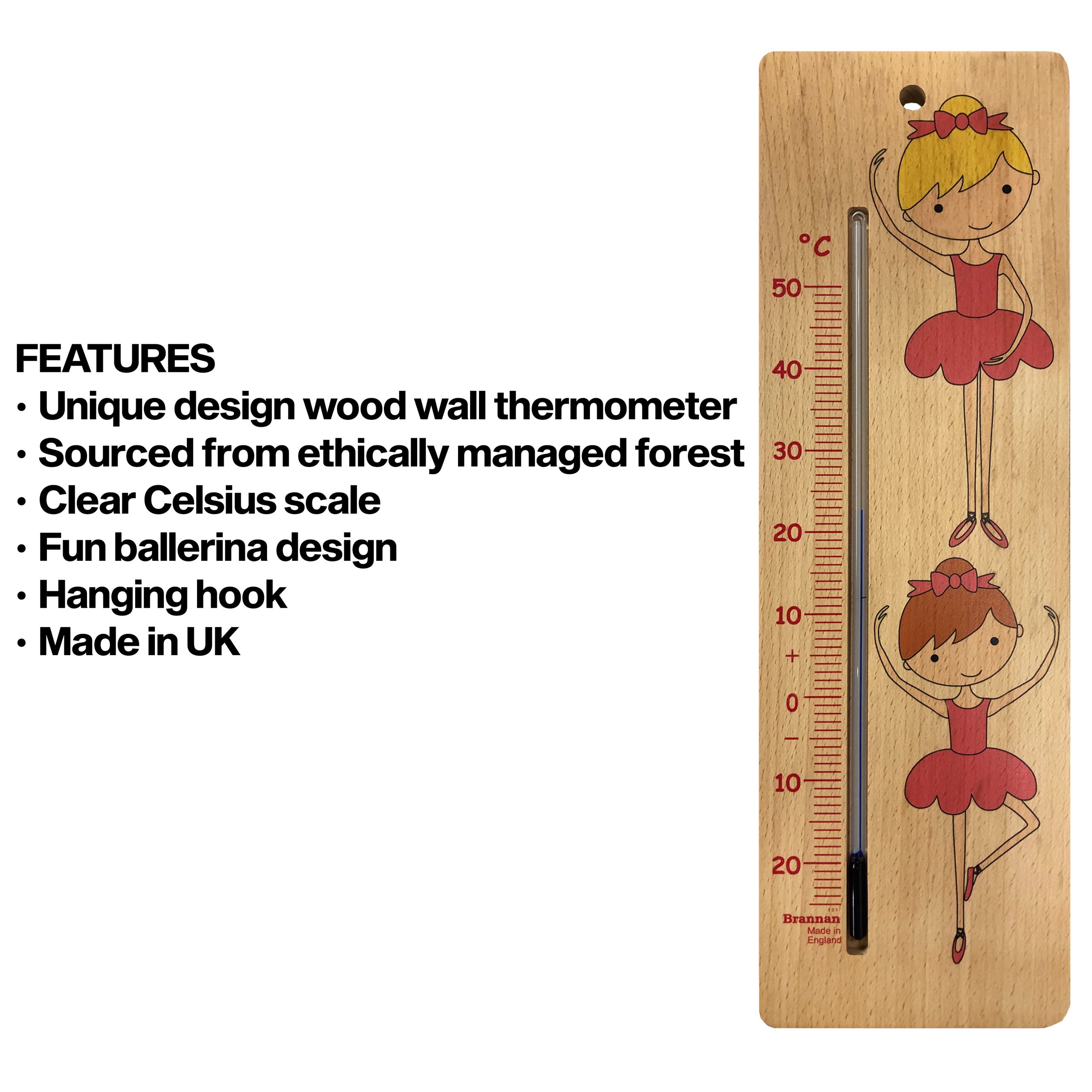 Extra large, ethically sourced, wood wall thermometer with fun ballerina design and clear printed temperature scale. This environmentally friendly thermometer is the perfect decorative addition to your child’s bedroom.