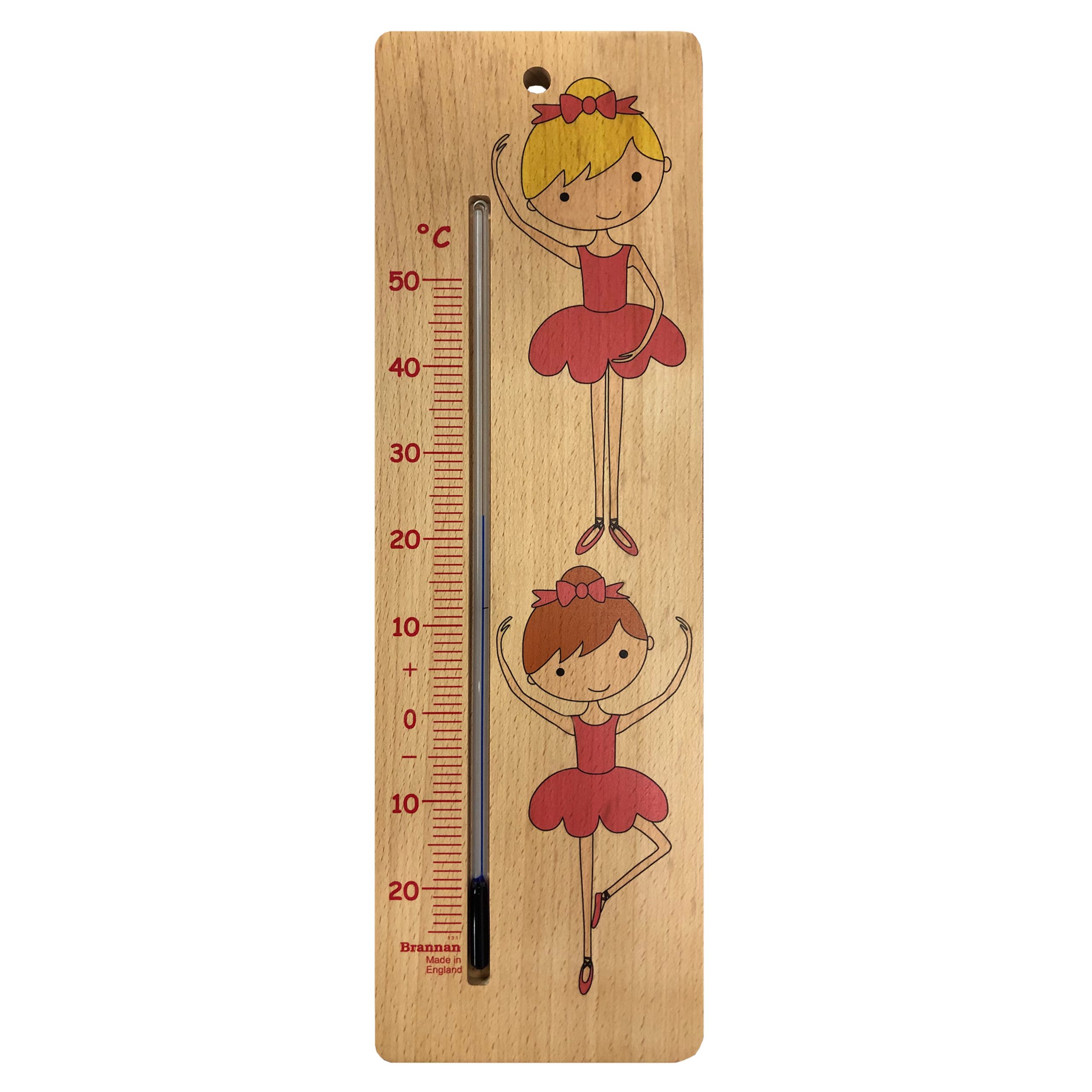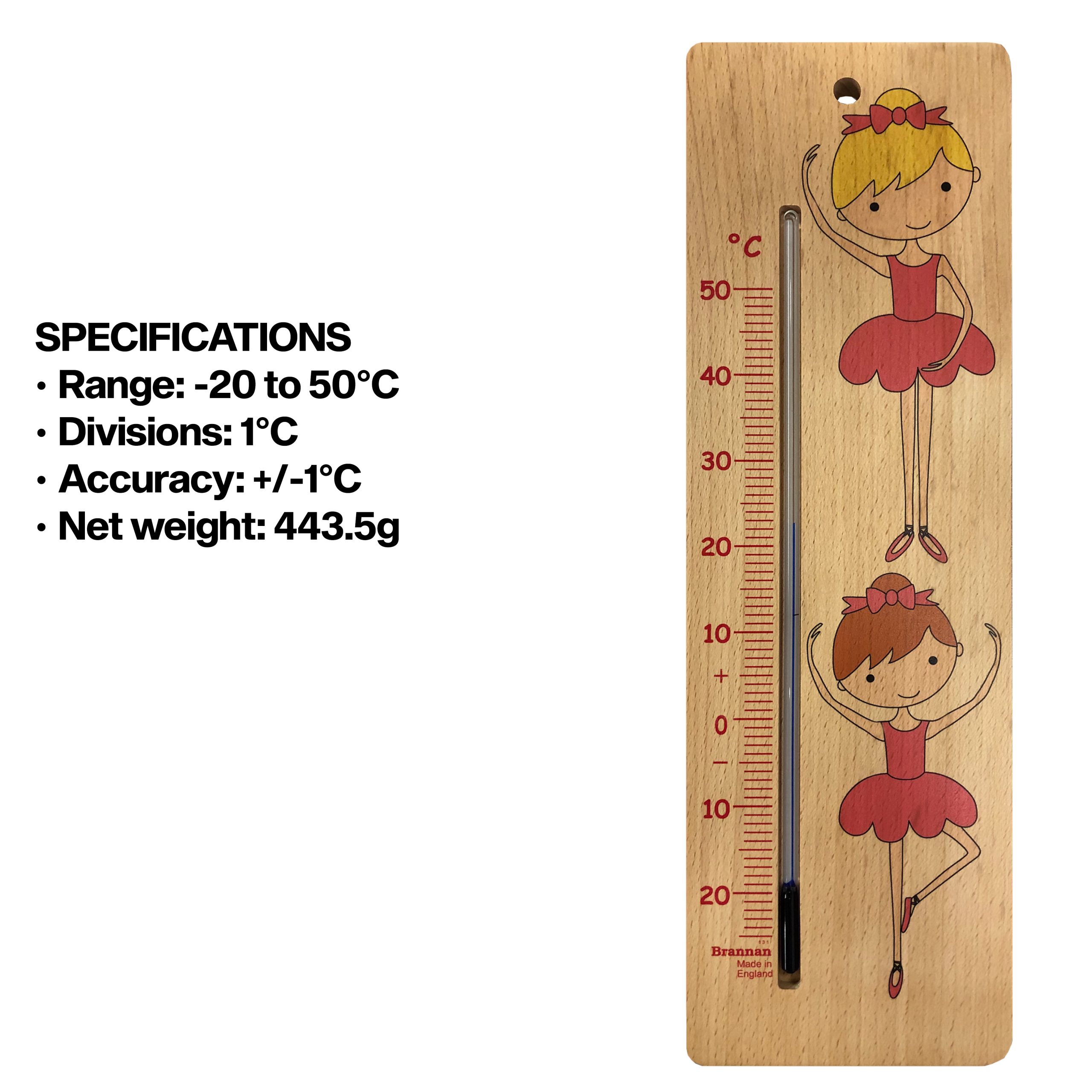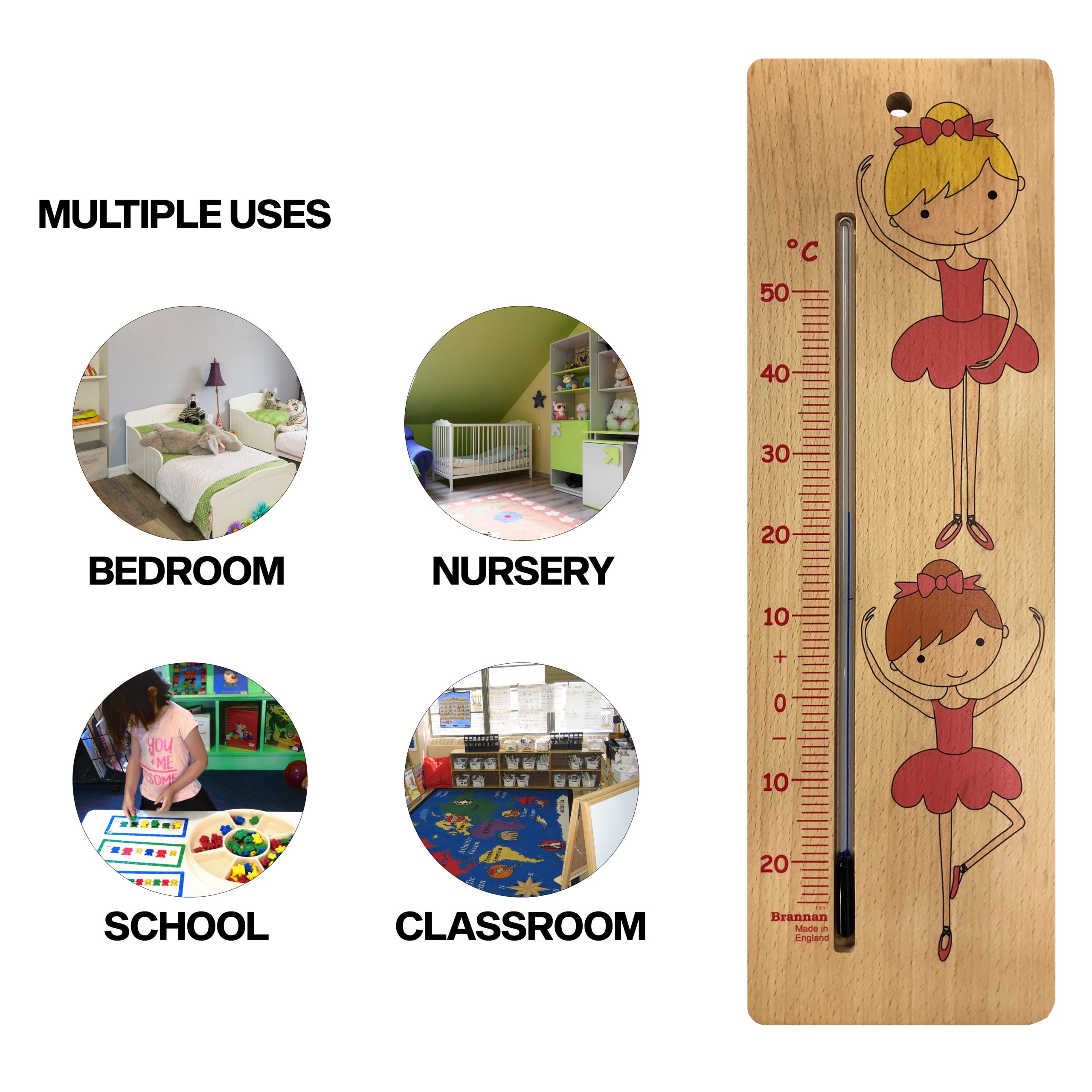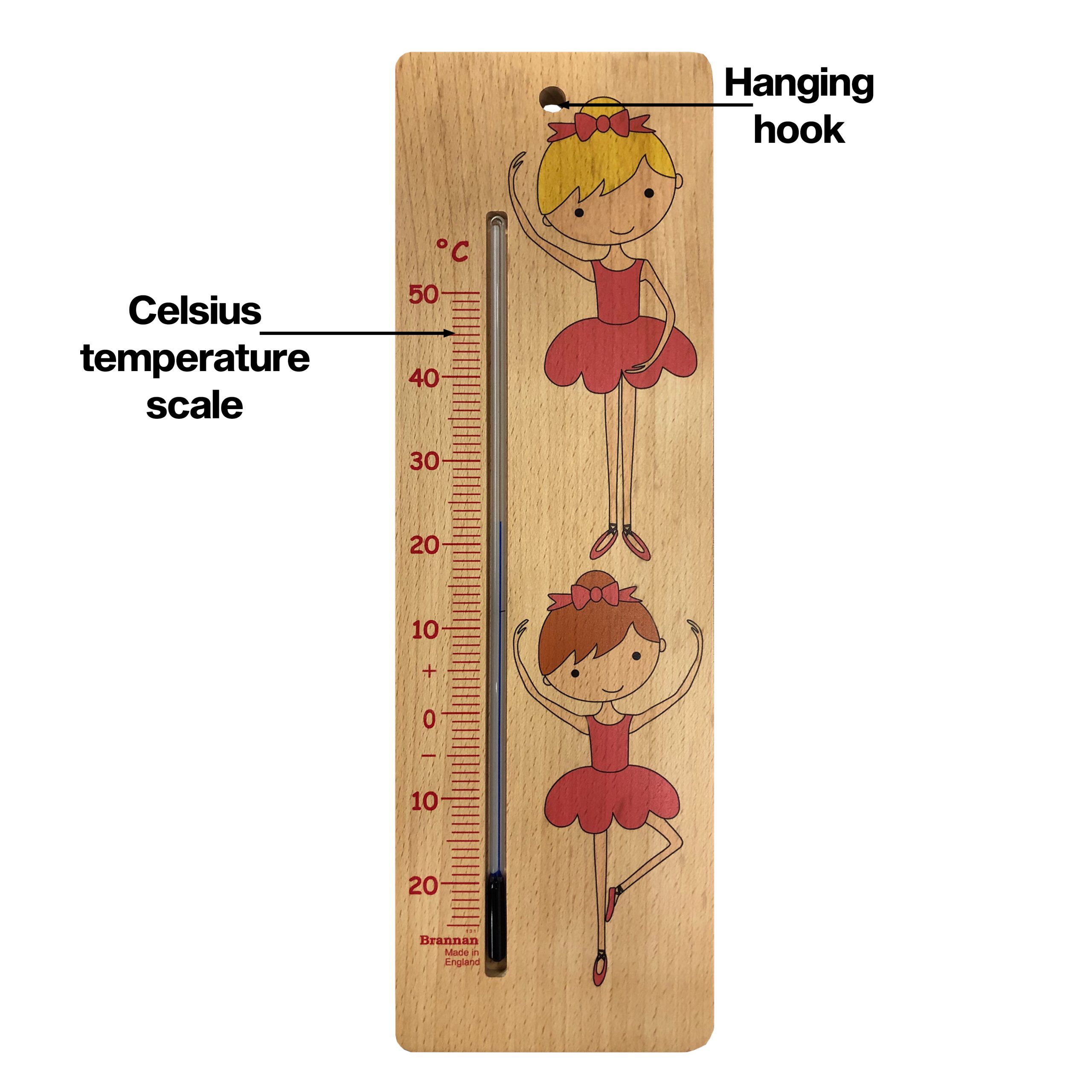 Extra large, ethically sourced, wood wall thermometer with fun ballerina design and clear printed temperature scale. This environmentally friendly thermometer is the perfect decorative addition to your child’s bedroom.