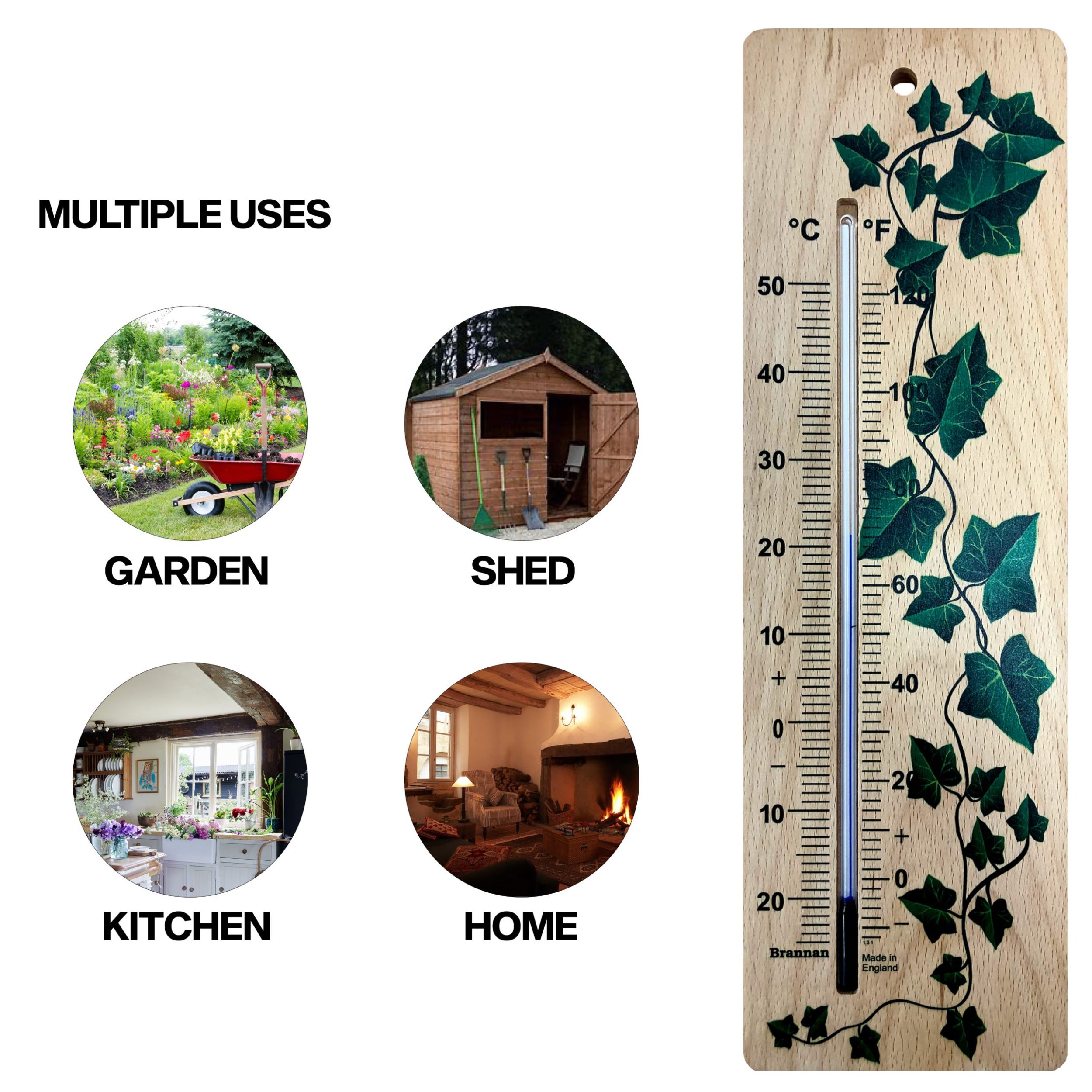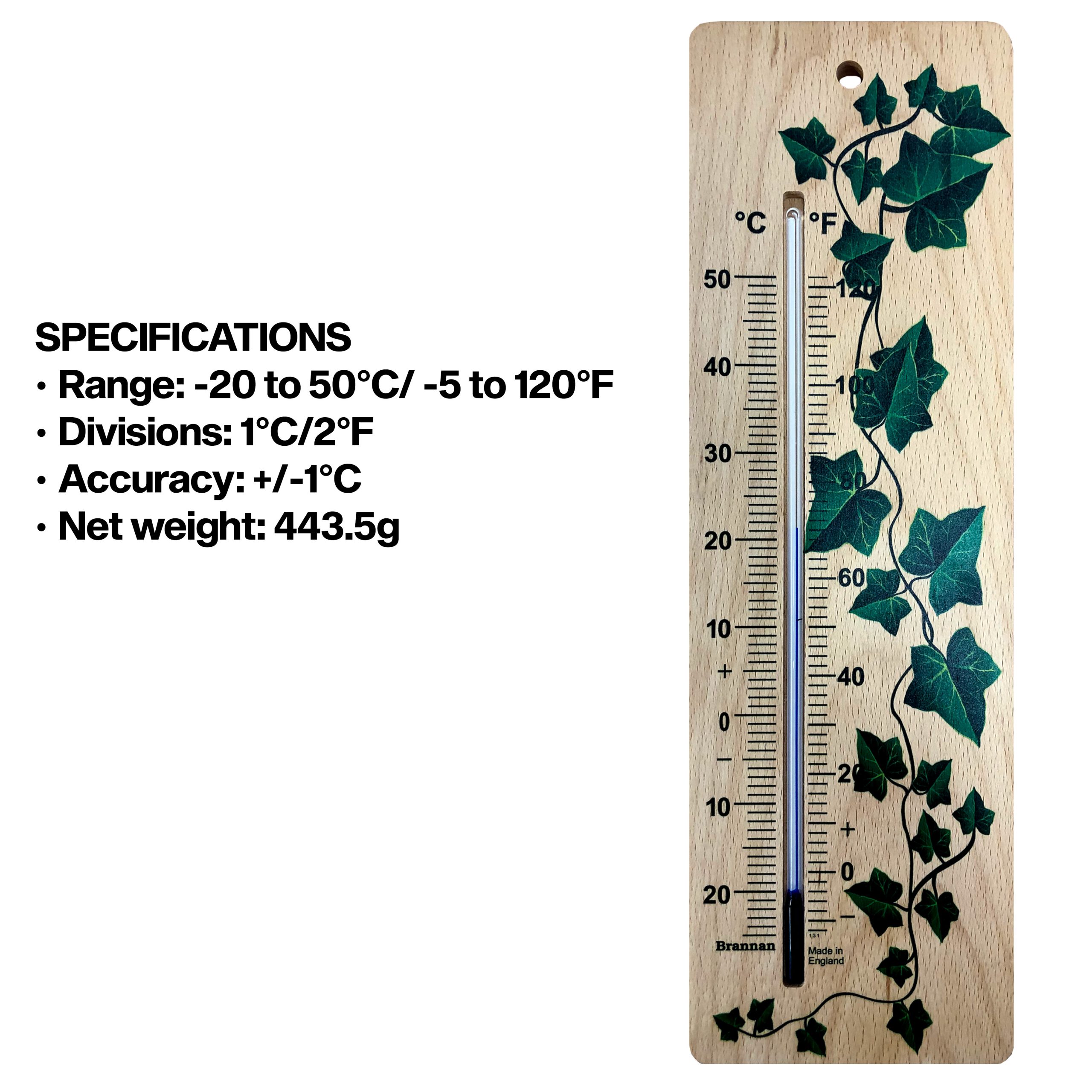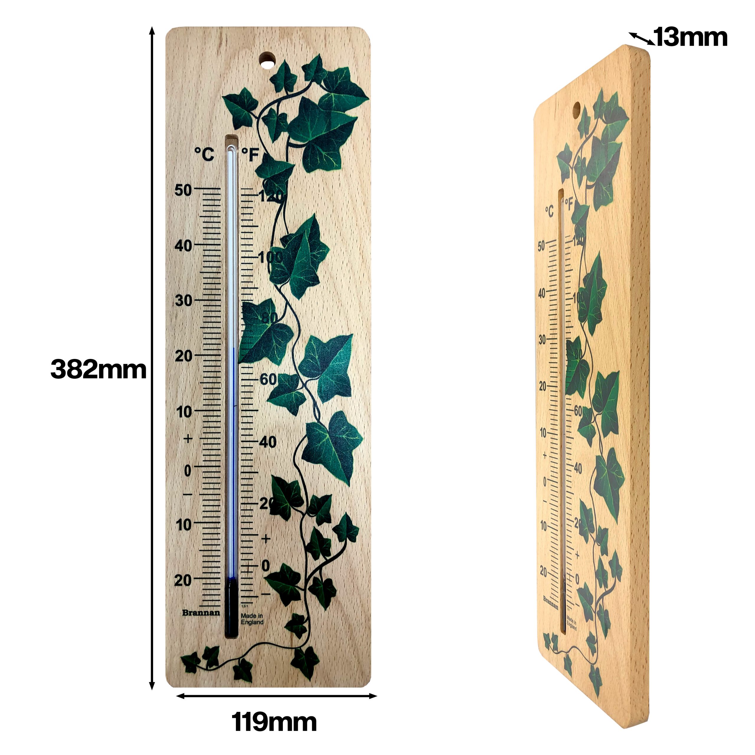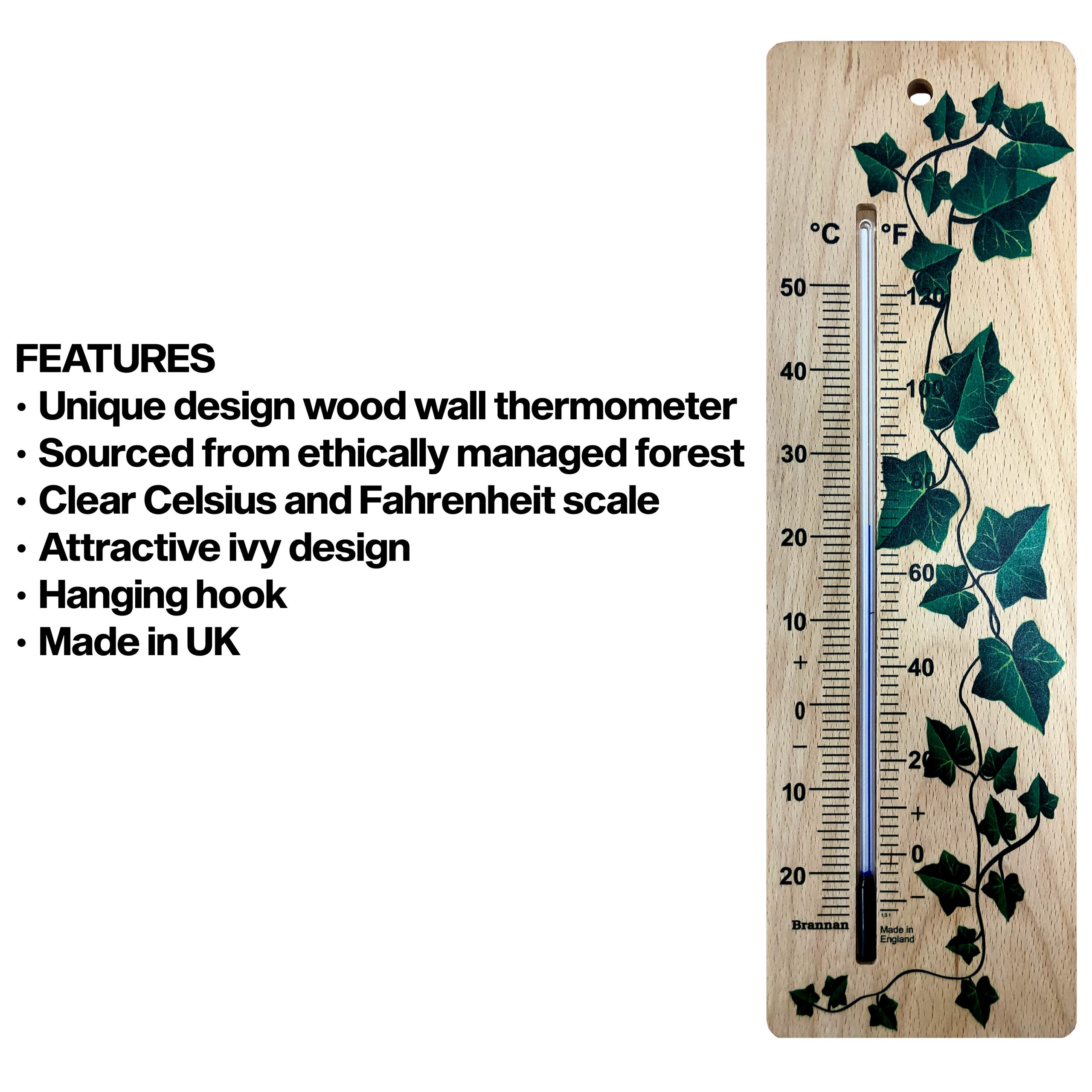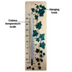 Extra large, ethically sourced, wood wall thermometer with attractive ivy design and clear printed temperature scale. This environmentally friendly thermometer is the perfect decorative addition to your home or garden. (Place in sheltered position if siting outdoors.)