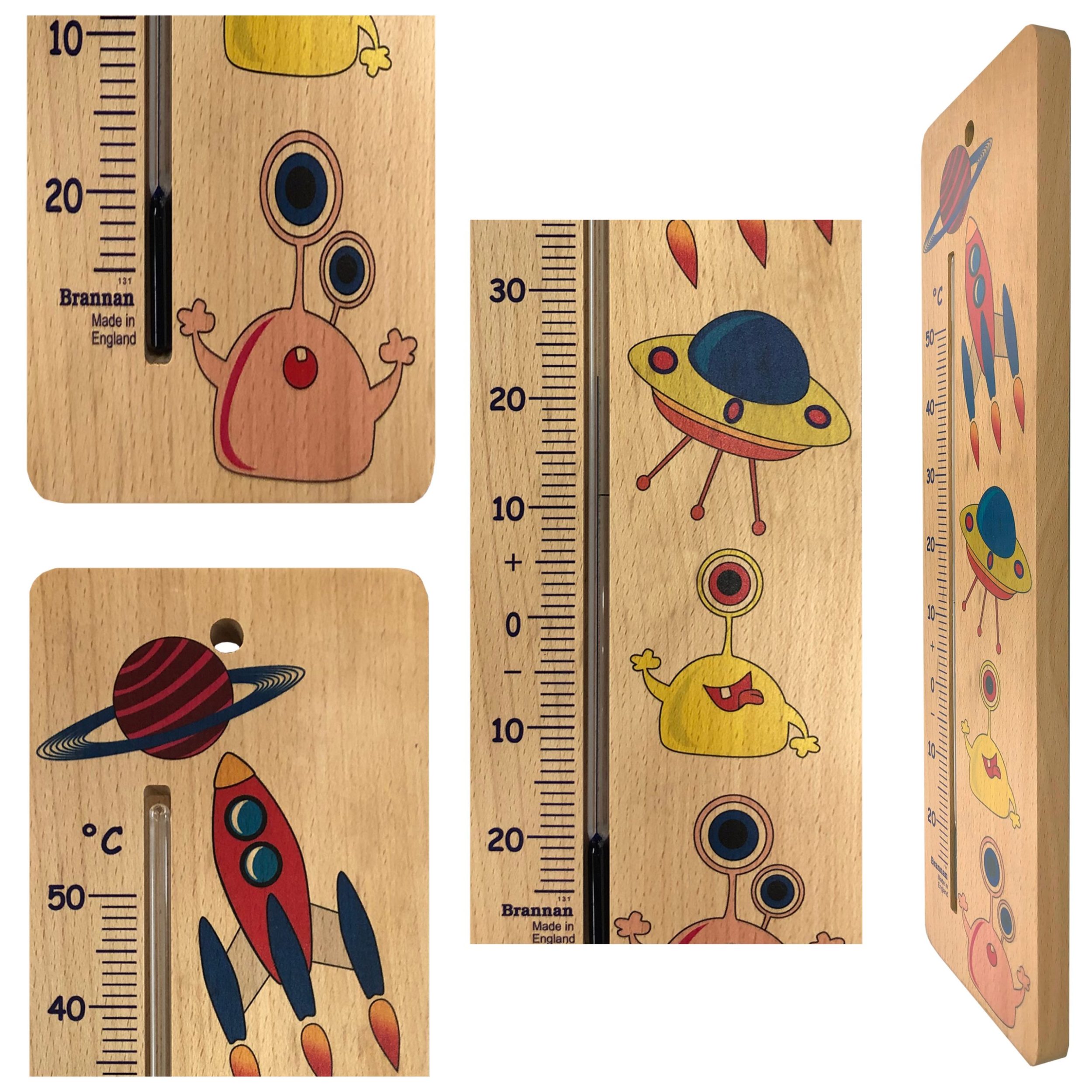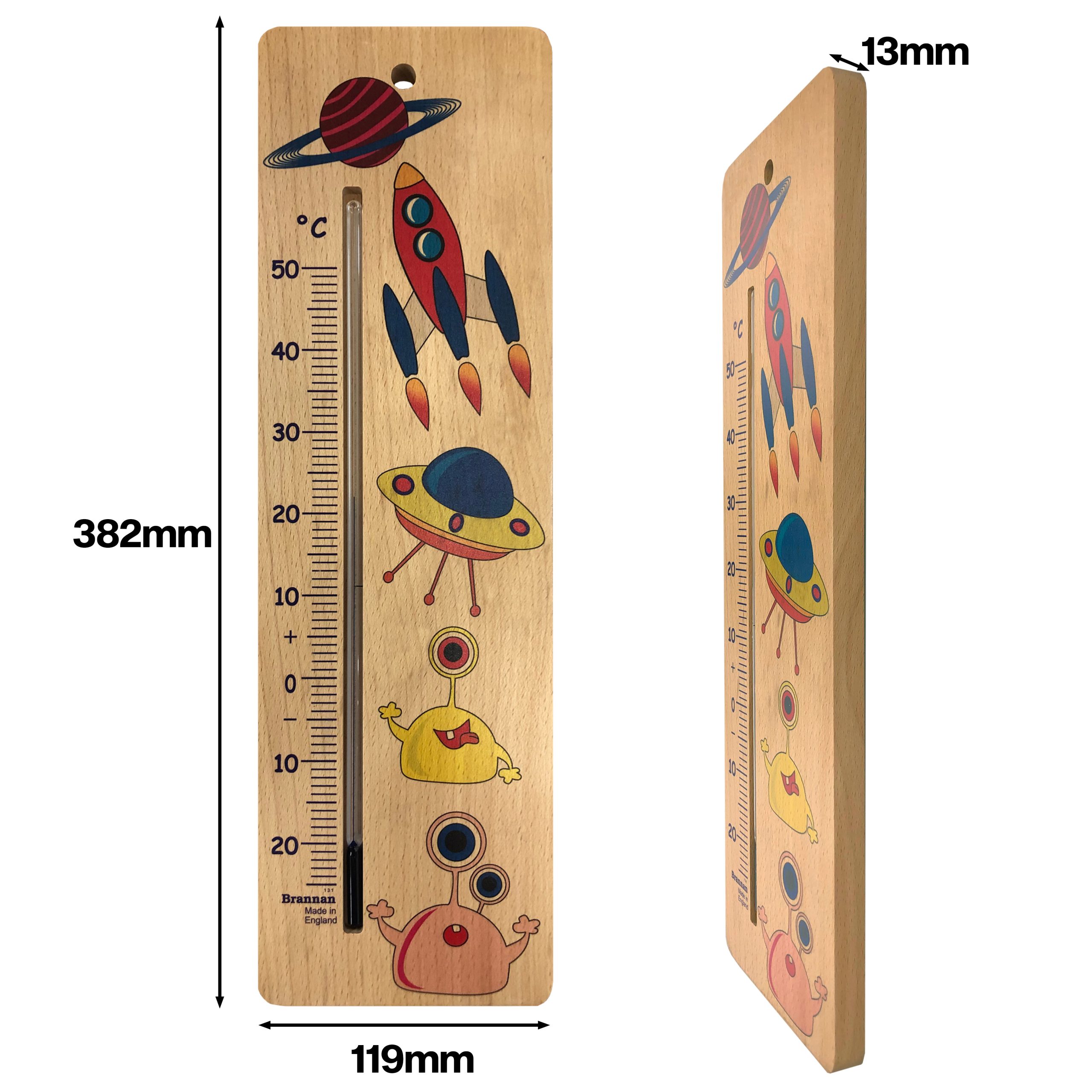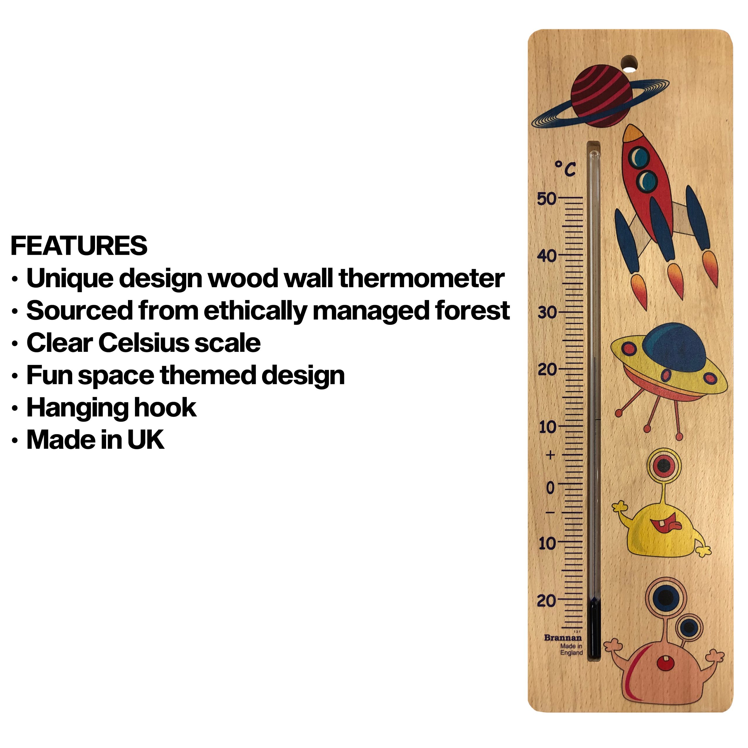 Extra large, ethically sourced, wood wall thermometer with fun space design and clear printed temperature scale. This environmentally friendly thermometer is the perfect decorative addition to your child’s bedroom or nursery.