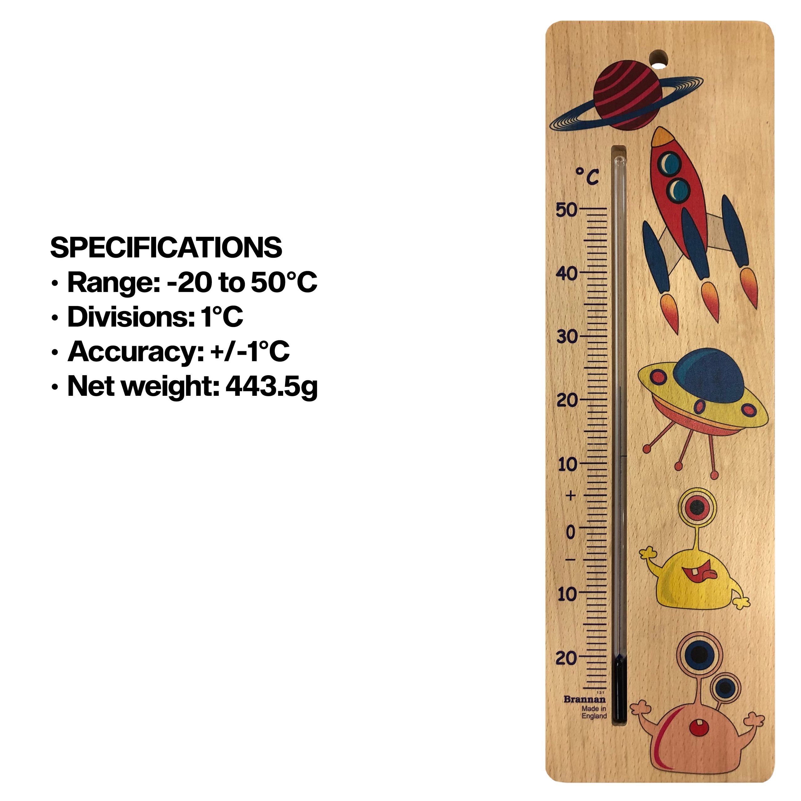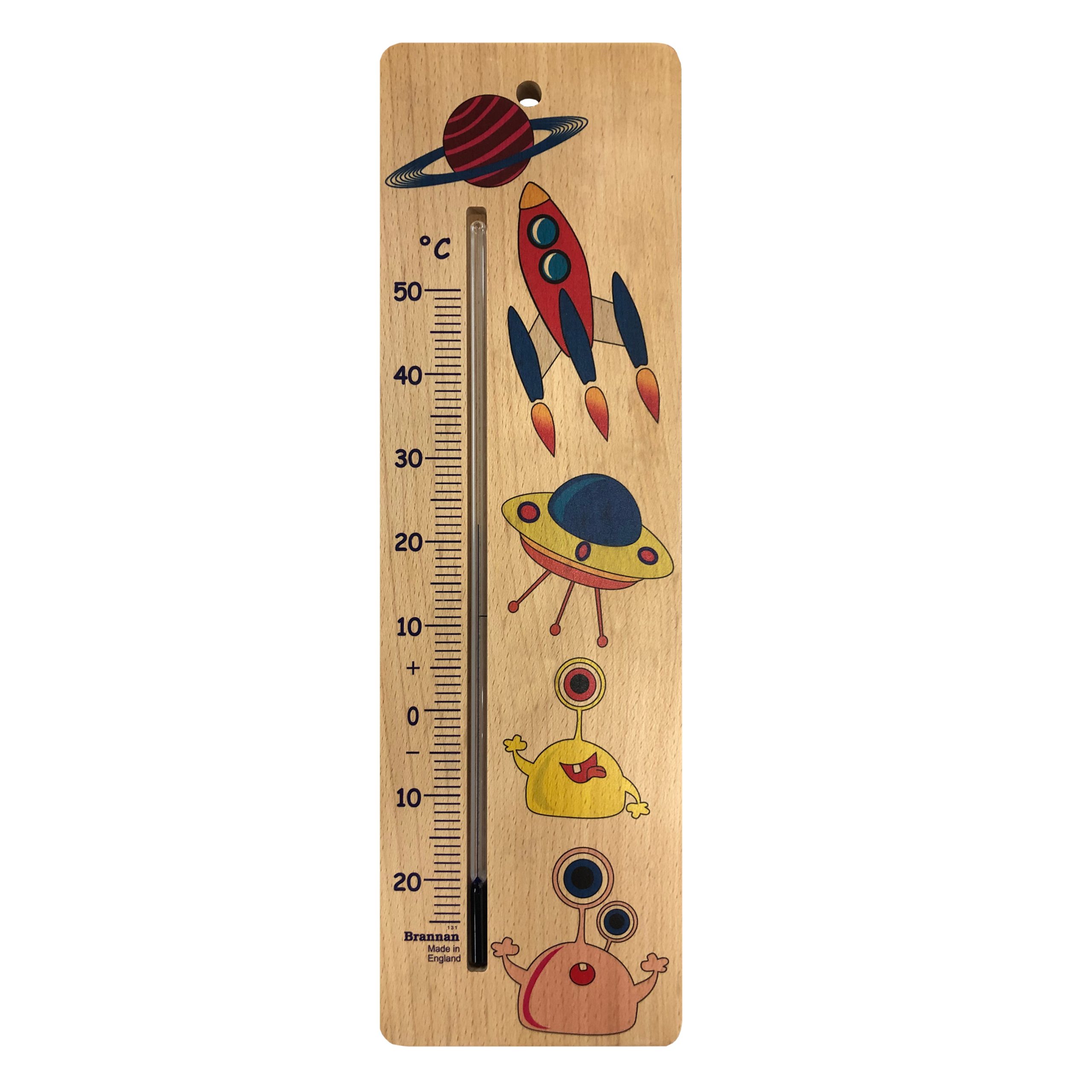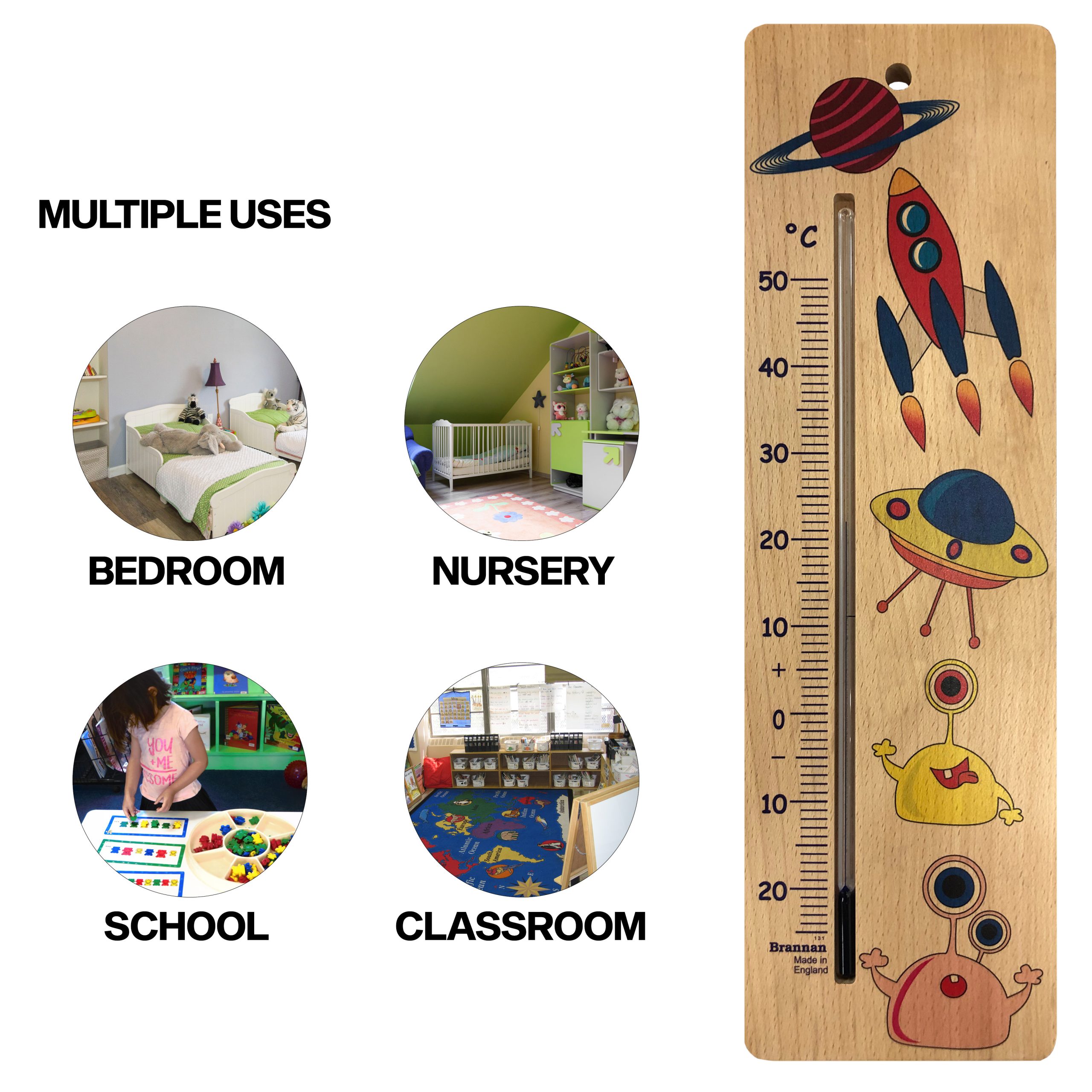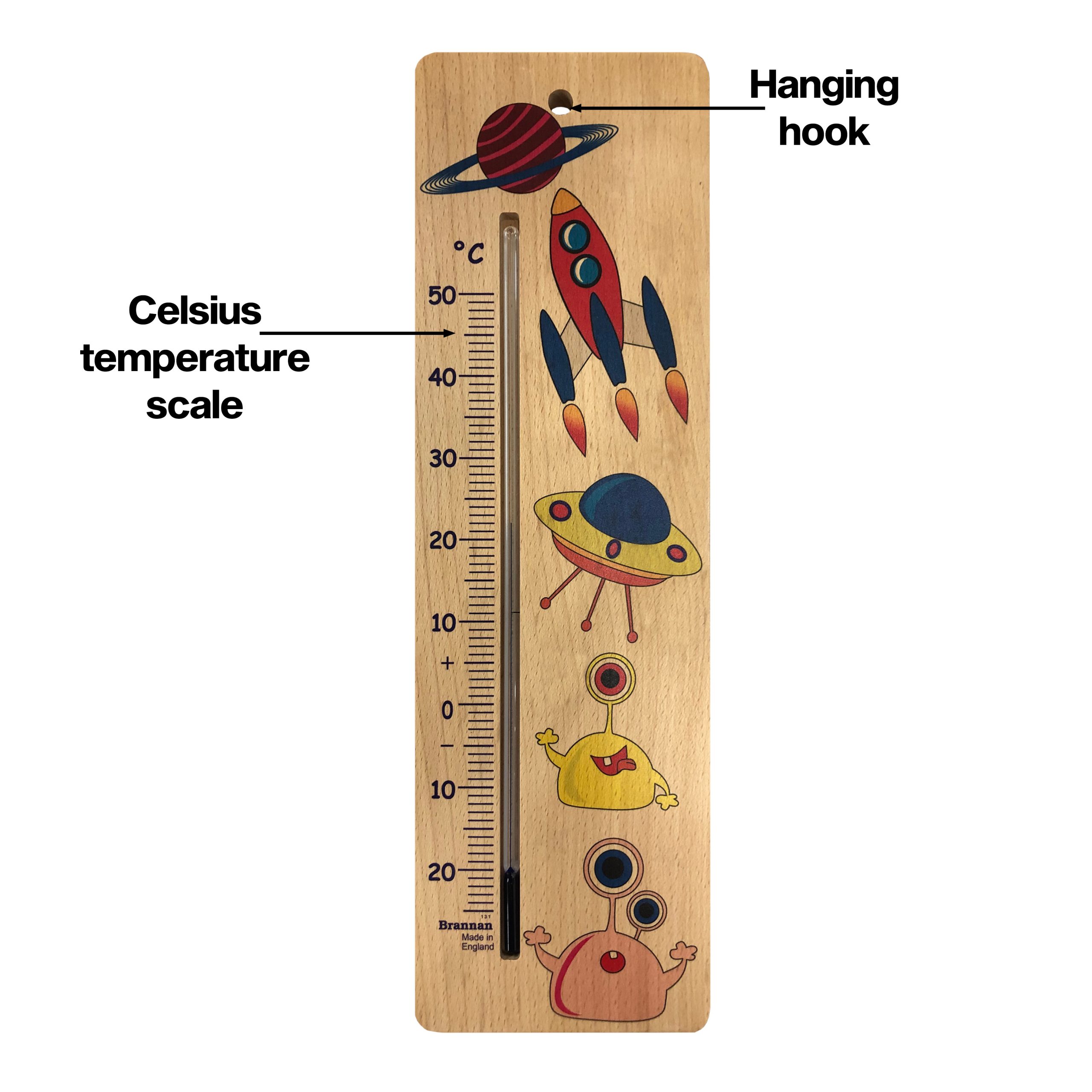 Extra large, ethically sourced, wood wall thermometer with fun space design and clear printed temperature scale. This environmentally friendly thermometer is the perfect decorative addition to your child’s bedroom or nursery.