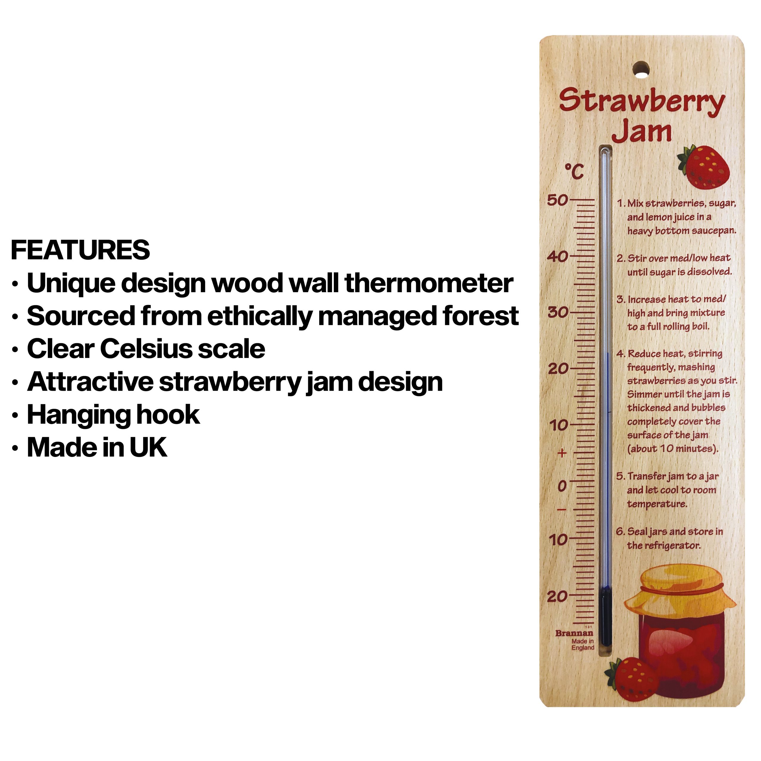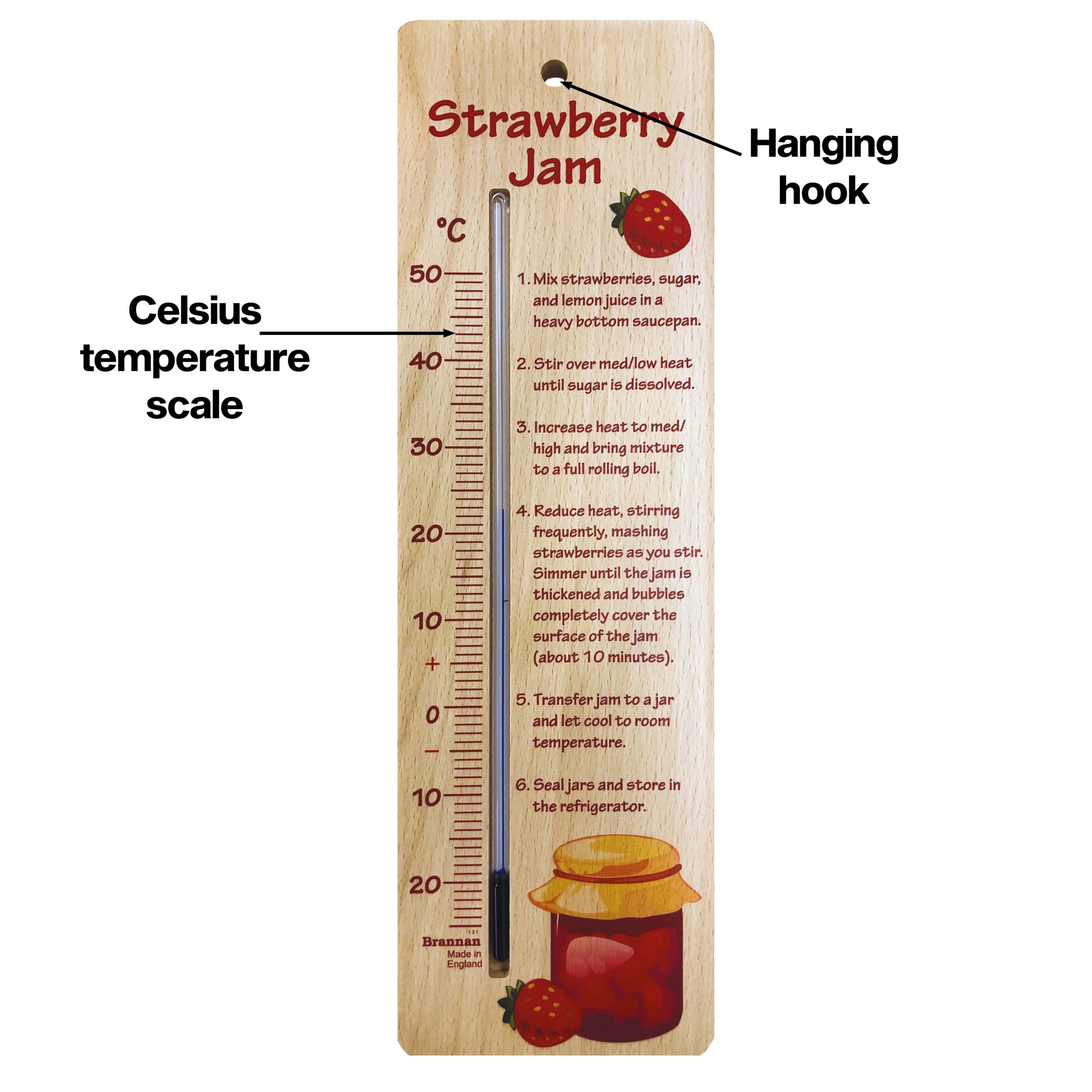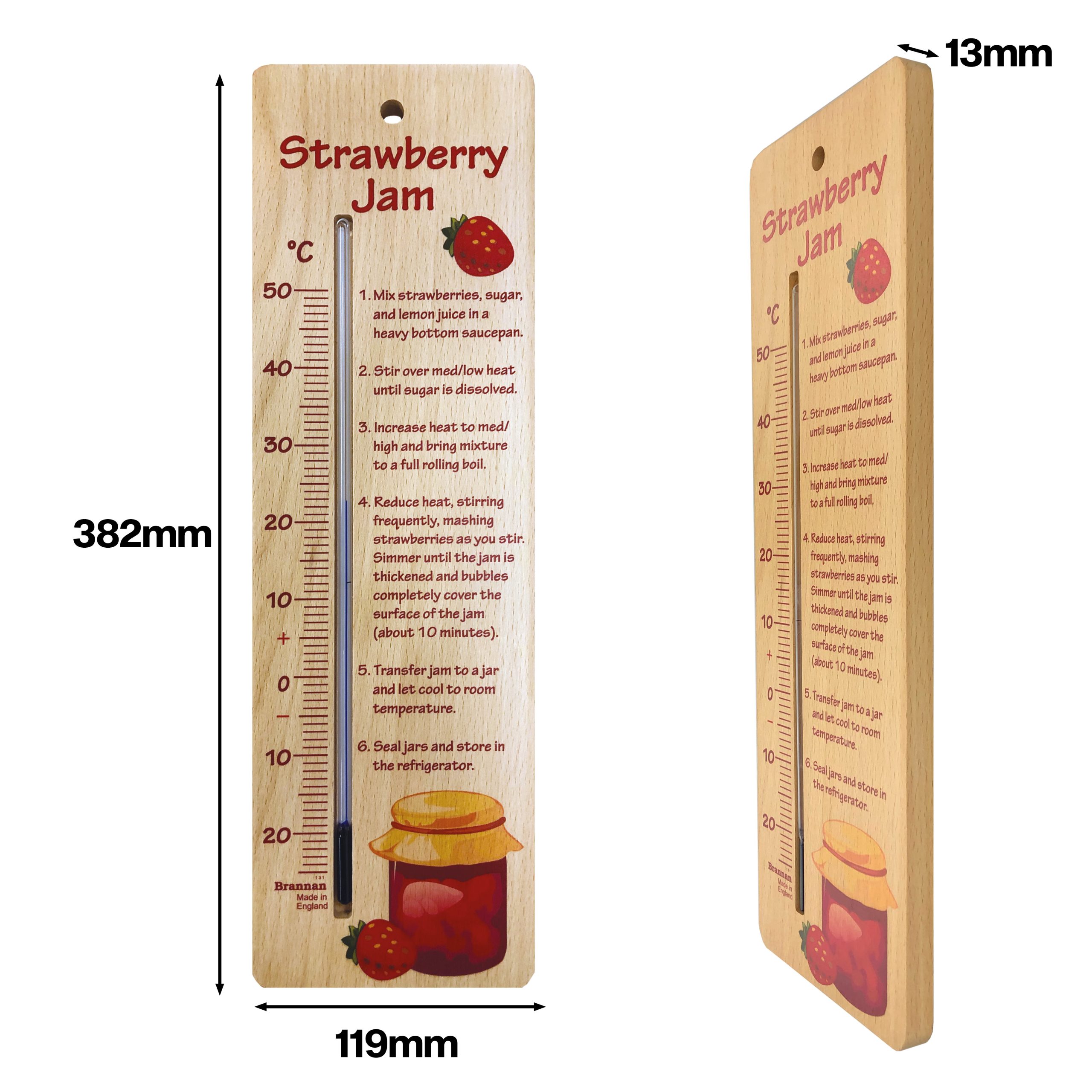 Extra large, ethically sourced, wood wall thermometer with attractive stawberry jam recipe design and clear printed temperature scale. This environmentally friendly thermometer is the perfect decorative addition to your kitchen.