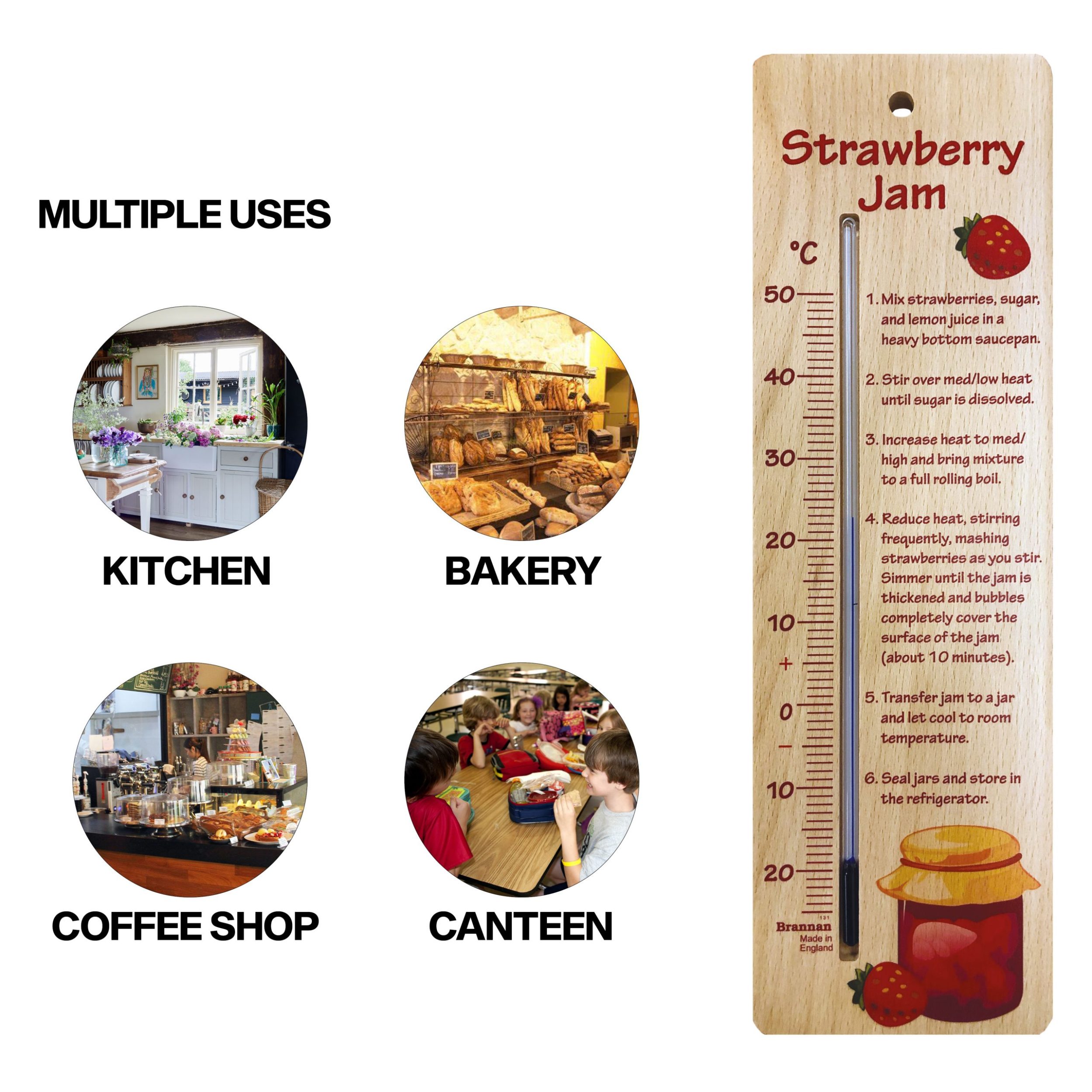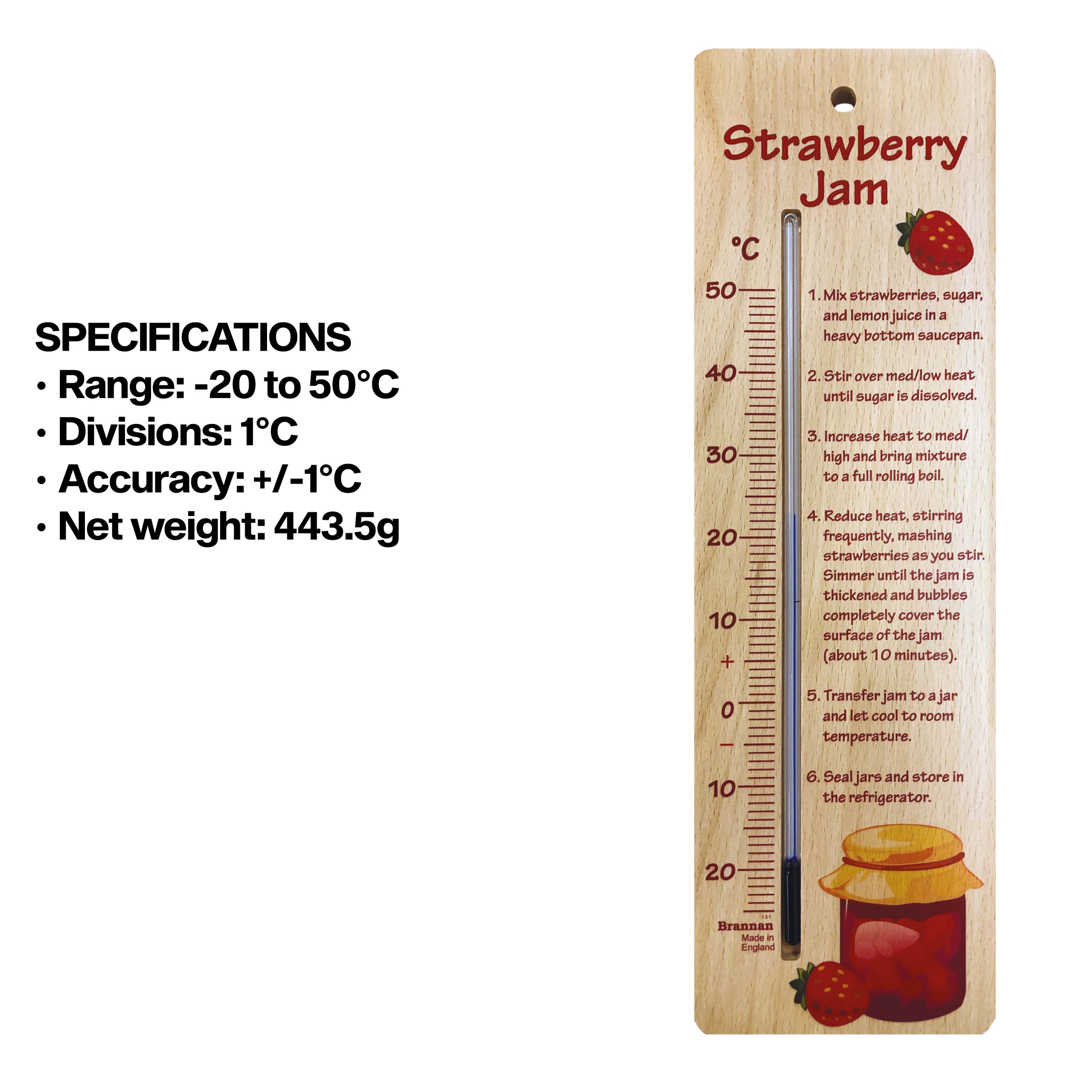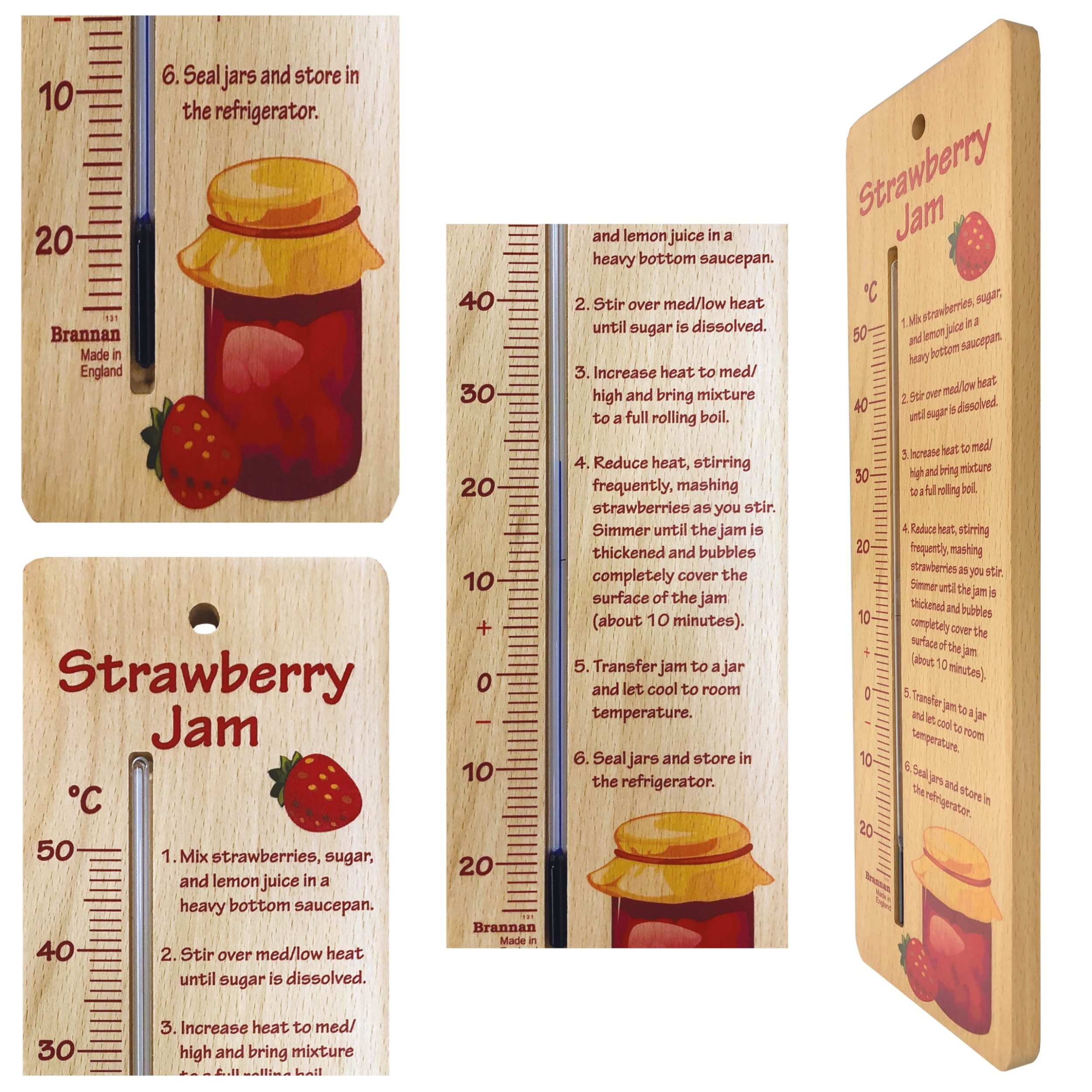 Extra large, ethically sourced, wood wall thermometer with attractive stawberry jam recipe design and clear printed temperature scale. This environmentally friendly thermometer is the perfect decorative addition to your kitchen.