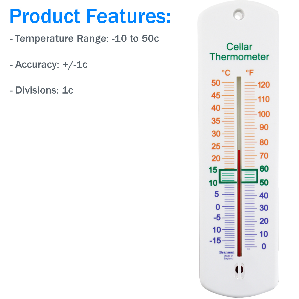 It is important that your cellar is kept at a constant temperature. This thermometer is suitable for storage of beers and wines, with clearly marked zone on scale to indicate recommended storage temperature.