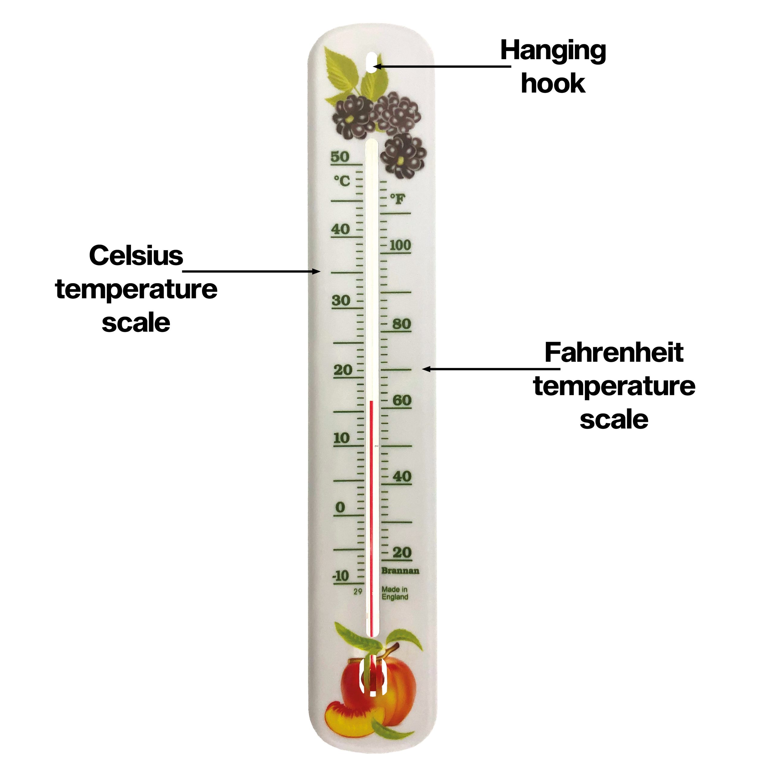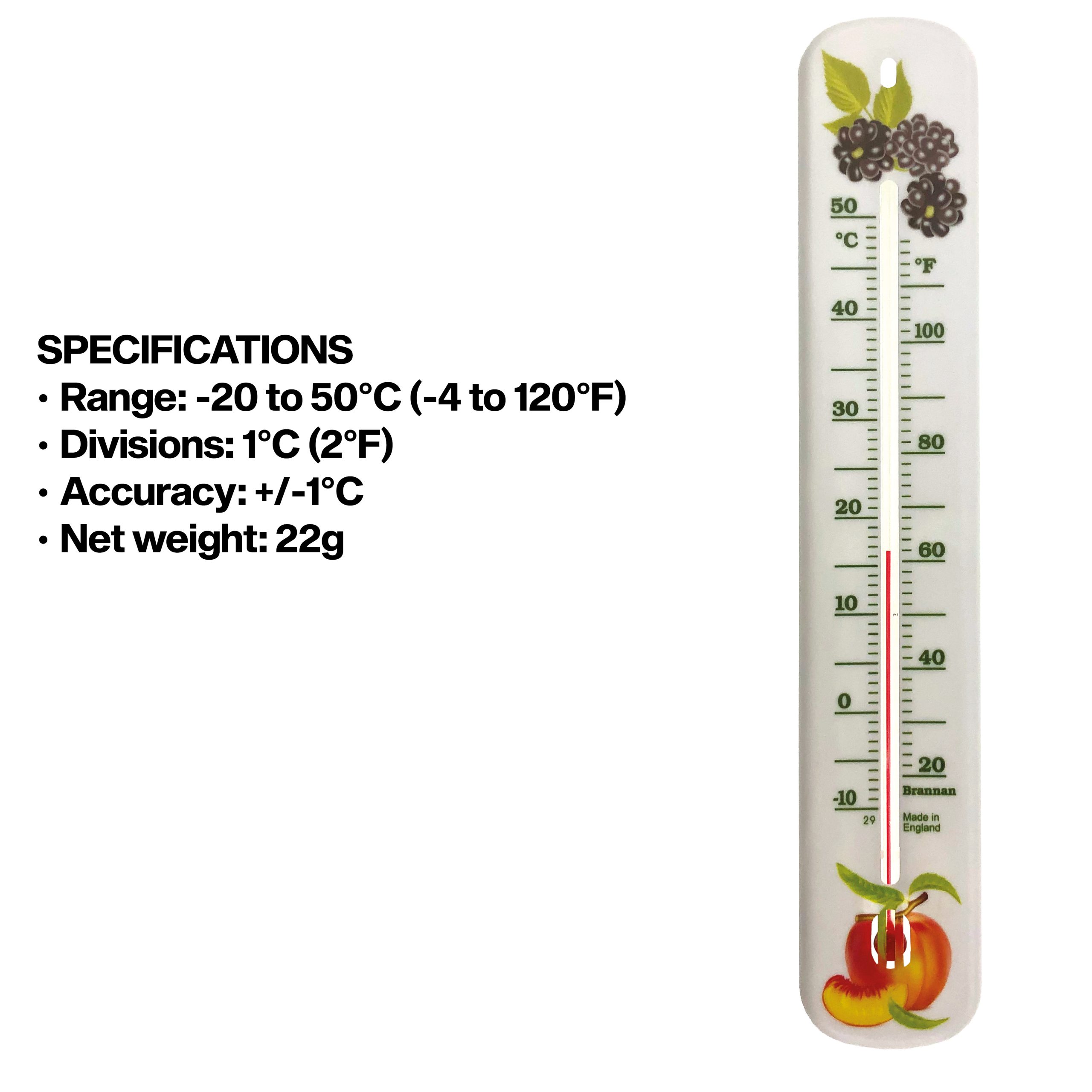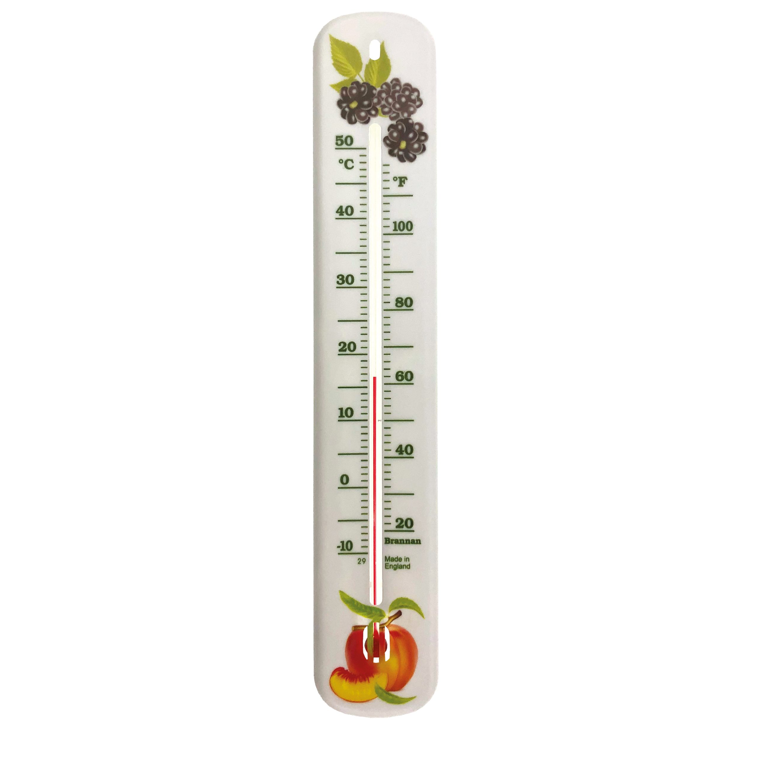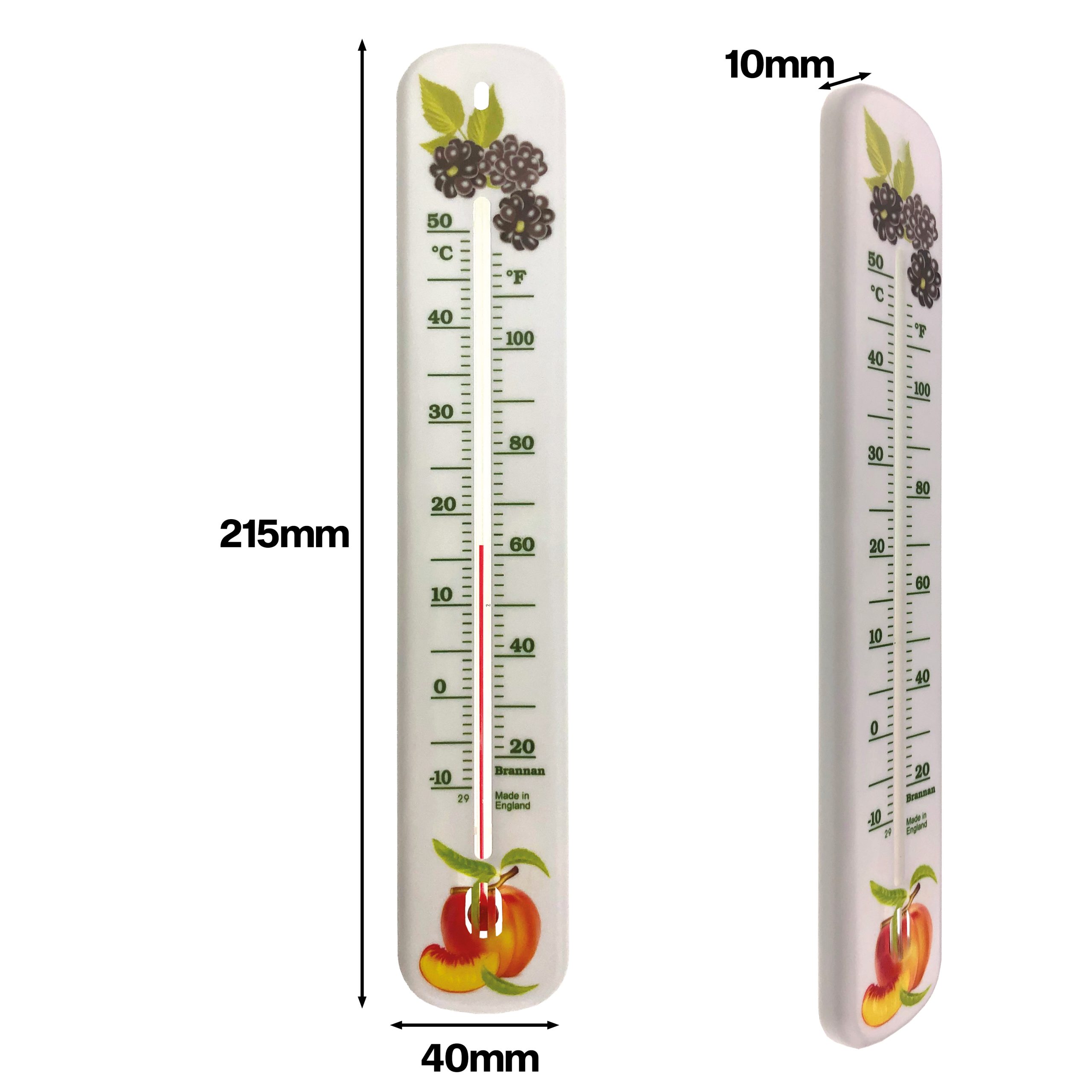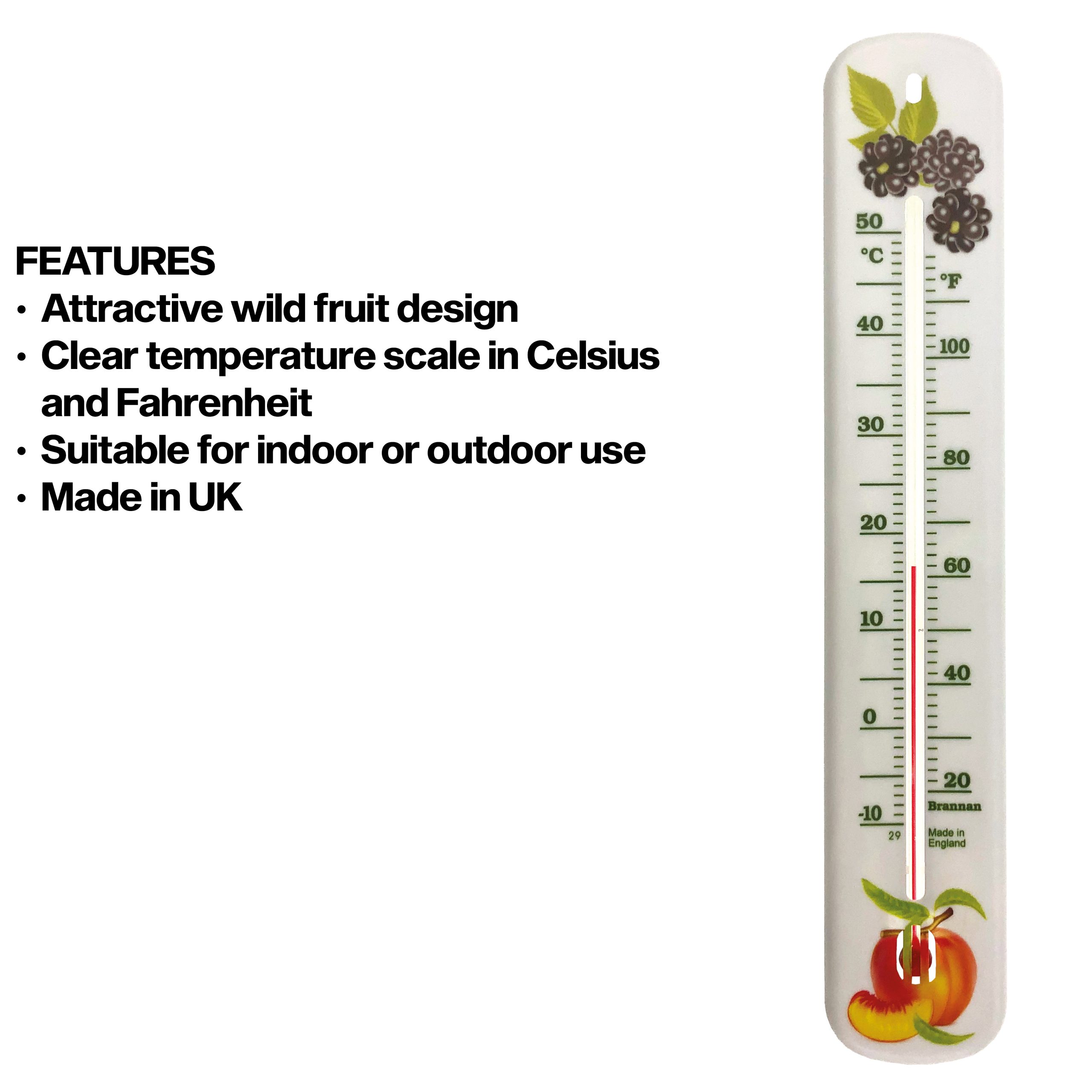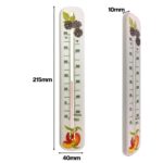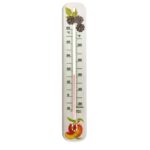 215mm plastic wall thermometers with colourful printed wild fruit design and temperature scale on white moulding.