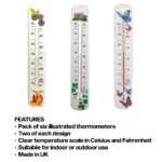 Pack of 6 plastic wall thermometers with 2 pieces of each design.